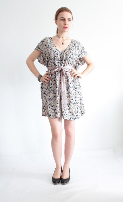 Piękna sukienka w kwiaty o ciekawym wykończeniu przy rękawach, z kieszeniami.