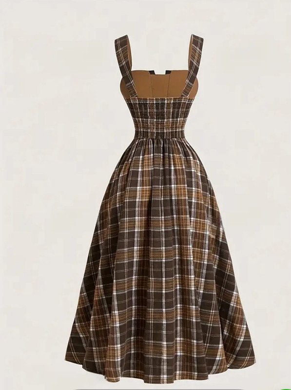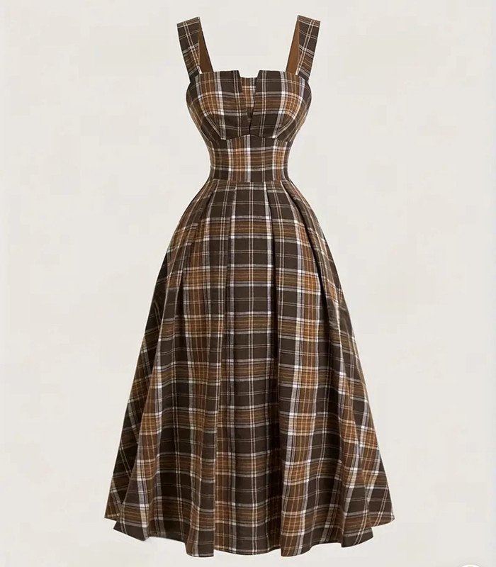 Zjawiskowa sukienka w stylu retro – dopasowany gorsetowy krój, szerokie ramiączka i rozkloszowany dół w klimacie lat 50. Kratka w odcieniach brązu, karmelu i śmietanki idealnie wpisuje się w styl vintage, pin-up, cottagecore, dark academia lub jesienny romantyzm.
