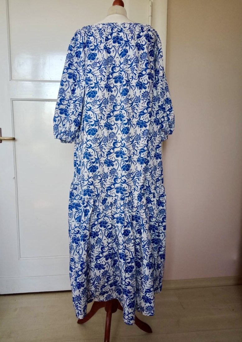 Nowa z metka,dluga sukienka firmy Sinsay. Rozmiar M ale może być uniwersalny. Material bawelna. Rekaw reglan,dlugi ściągany gumka. Dekolt sciagany szeroka guma. W fole marszczona falbana długości 55 cm. Pod pachami 102 cm.długość 129 cm.
