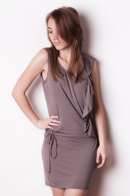 Sukienka marki Intimissimi. Z boku ozdobna falbana, na dole sznurek do zawiązywania. Rozmiar na metce S. Materiał rozciągliwy. Skład materiału to: 92%modal, 8% elastan. Wymiary to ok.: szerokość 42cmx2, długość ok. 80cm. Kolor brązowo-szary. Marka Intimissimi. Stan: NOWA!