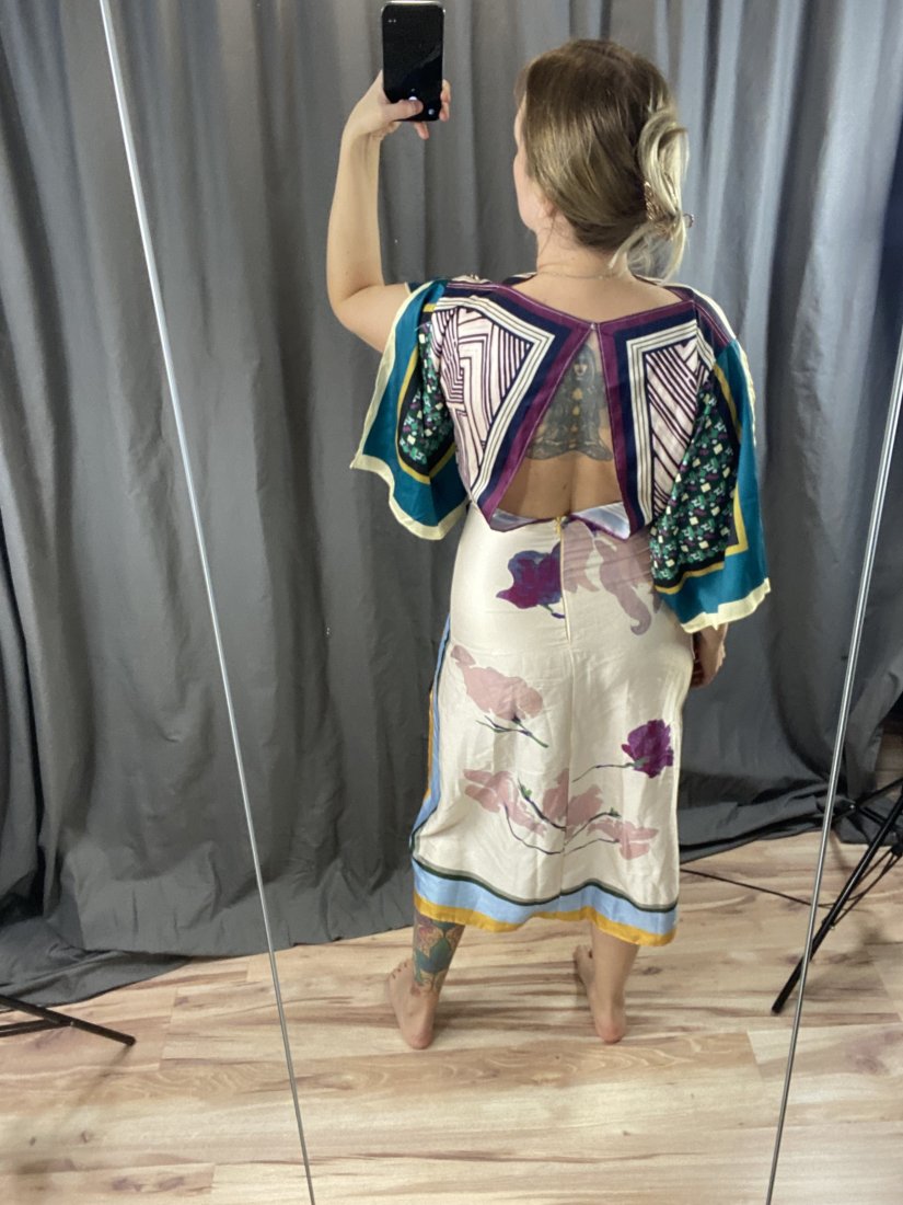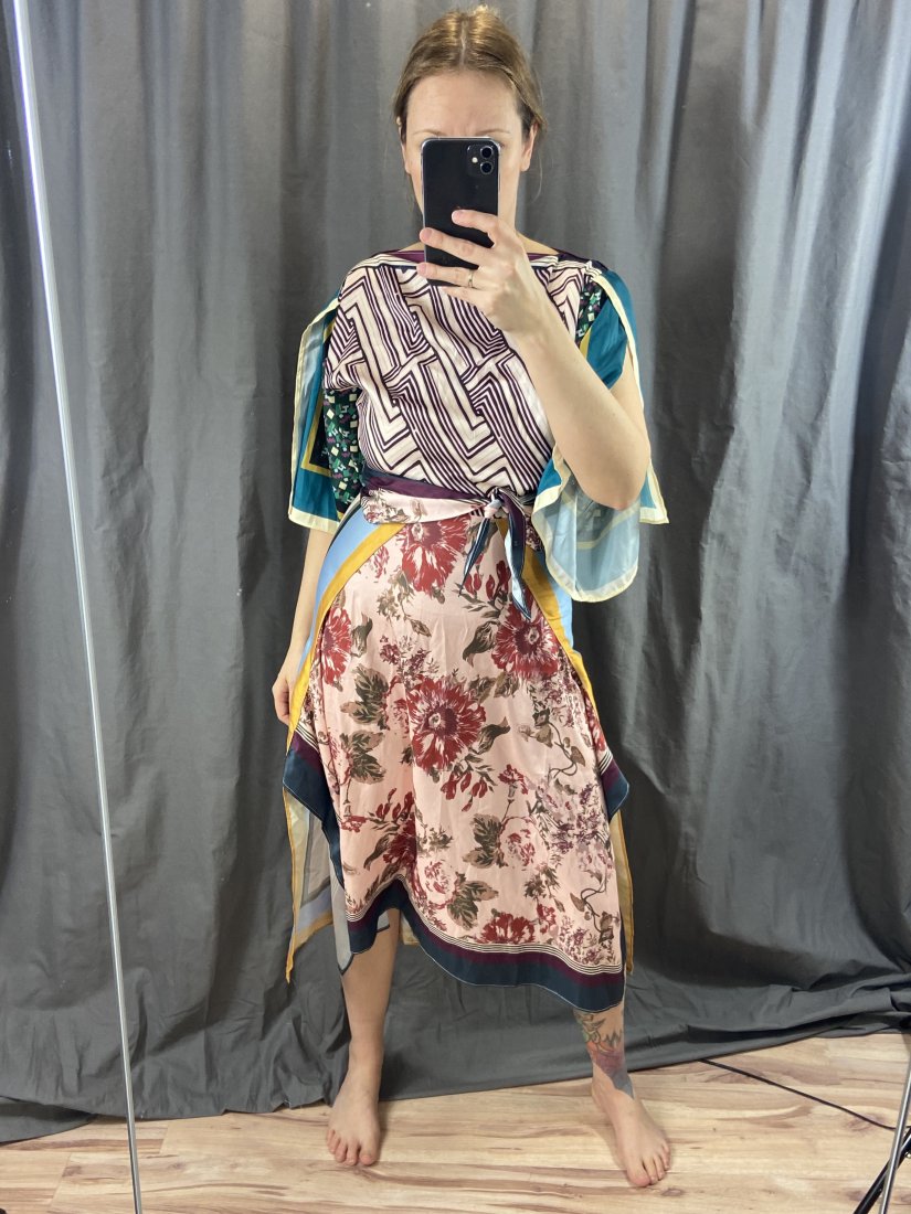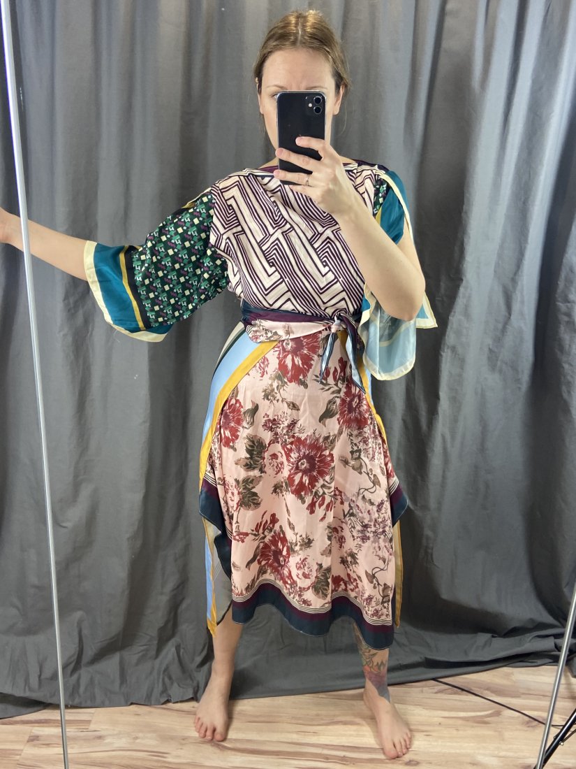 Sukienka z satynowego poliestru (jakby z takich chust kolorowych).