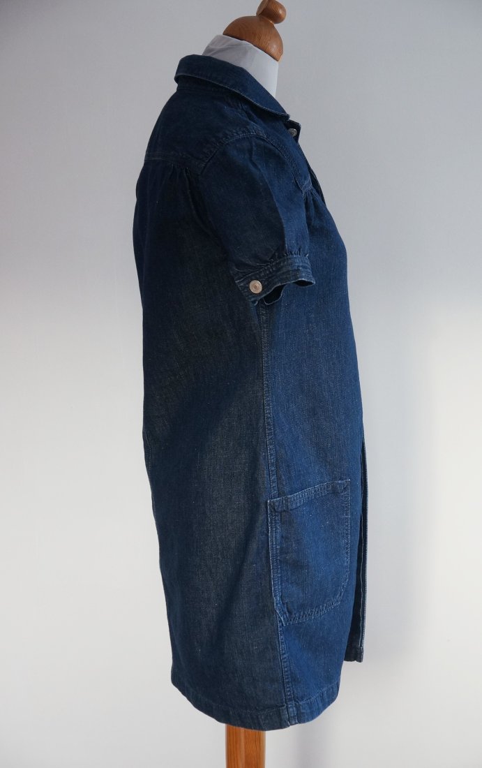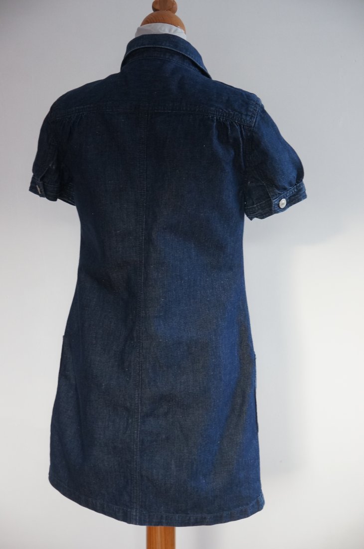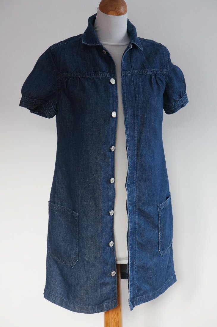 Jeansowa sukienka marki GAP. Kolor ciemny granat. Na całej długości zapinana na metalowe guziki. Zapięcie kryte. Z przodu dwie naszyte kieszenie. Krótkie rękawki zakończone mankietem. Mankiety zapinane na guzik. Stan DOBRY plus.