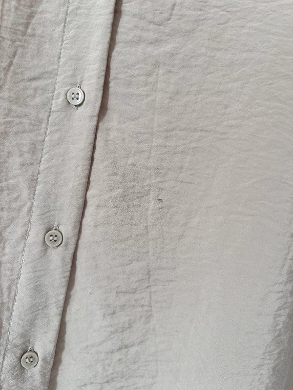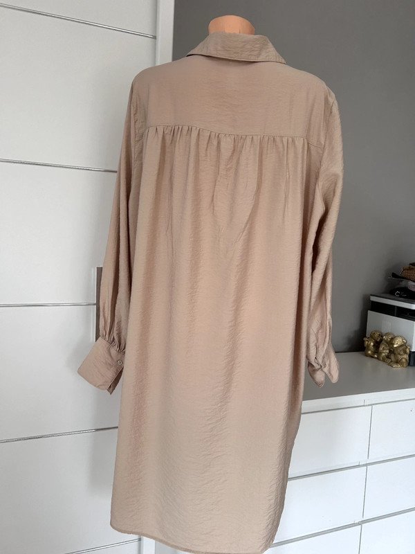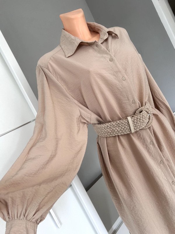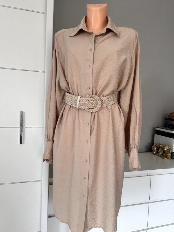Sukienka koszulowa firmy H&M, rozmiar L 40. Styl koszulowy, luźny krój. Posiada długie rękawy zakończone mankietami zapinanymi na guziki. Z tyłu ma lekkie marszczenie na linii karczka. Materiał jest miękki kraszowany o lekkiej teksturze. Jest to świetny codzienny strój o minimalistycznym, ale również eleganckim wyglądzie. Ze względu na dużą ilość guzików bardzo łatwo się ją zakłada. Na ostatnim zdjęciu widać mikrodziurki do zaszycia, mało widoczne, ale wolę o nich wspomnieć. Old money style, szafa kapsułowa. Polecam, pasek nie jest w zestawie.