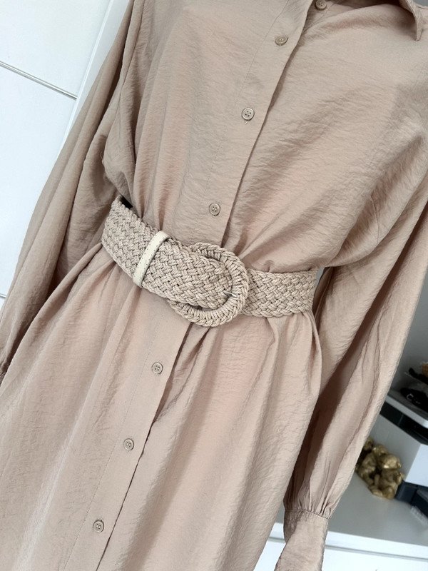 Sukienka koszulowa firmy H&M, rozmiar L 40. Styl koszulowy, luźny krój. Posiada długie rękawy zakończone mankietami zapinanymi na guziki. Z tyłu ma lekkie marszczenie na linii karczka. Materiał jest miękki kraszowany o lekkiej teksturze. Jest to świetny codzienny strój o minimalistycznym, ale również eleganckim wyglądzie. Ze względu na dużą ilość guzików bardzo łatwo się ją zakłada. Na ostatnim zdjęciu widać mikrodziurki do zaszycia, mało widoczne, ale wolę o nich wspomnieć. Old money style, szafa kapsułowa. Polecam, pasek nie jest w zestawie.
