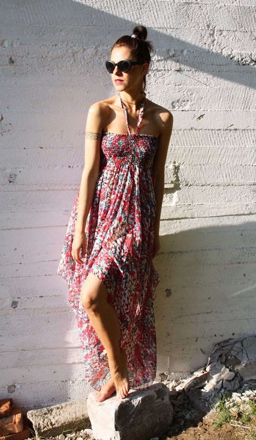 Letnia,zwiewna sukienka w kwiaty,zawiązywana na szyi,przewaga czerwieni,stan bardzo dobry,rozm uniwersalny