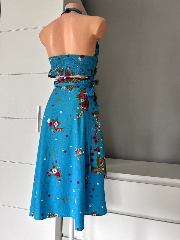 Sukienka firmy Charms, 100 % bawełna, a więc przewiewna, nie posiada metki z rozmiarem, moim zdaniem to S/M. Jest z zakładem, więc posiada możliwość regulacji w pasie. Na plecach ma pasek z gumeczkami, lekko asymetryczna, wiązana w pasie z boku. Piękna, nasycona orientalna kolorystyka, turkus z różem