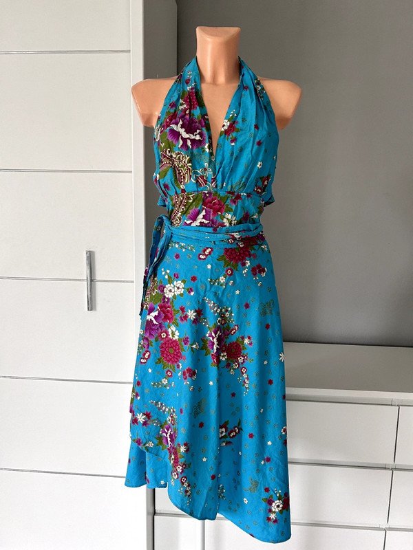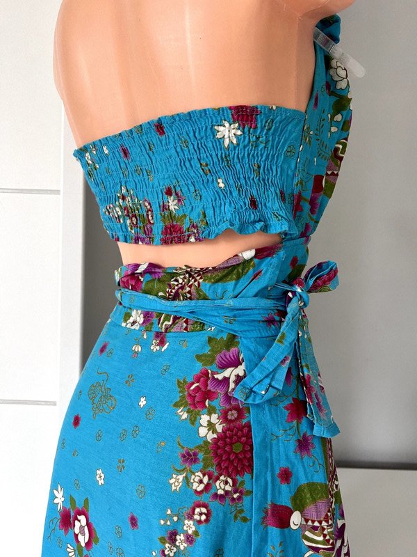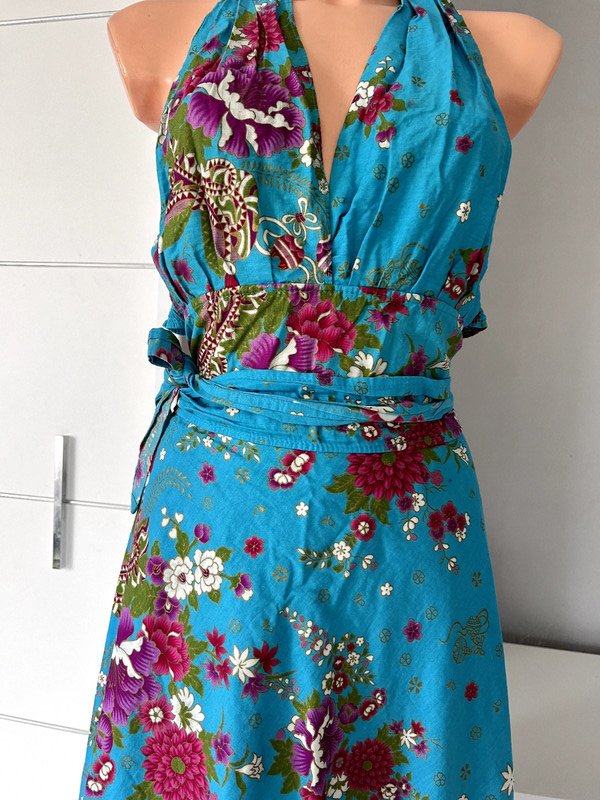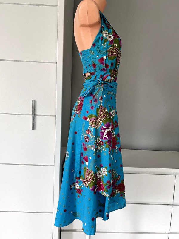 Sukienka firmy Charms, 100 % bawełna, a więc przewiewna, nie posiada metki z rozmiarem, moim zdaniem to S/M. Jest z zakładem, więc posiada możliwość regulacji w pasie. Na plecach ma pasek z gumeczkami, lekko asymetryczna, wiązana w pasie z boku. Piękna, nasycona orientalna kolorystyka, turkus z różem