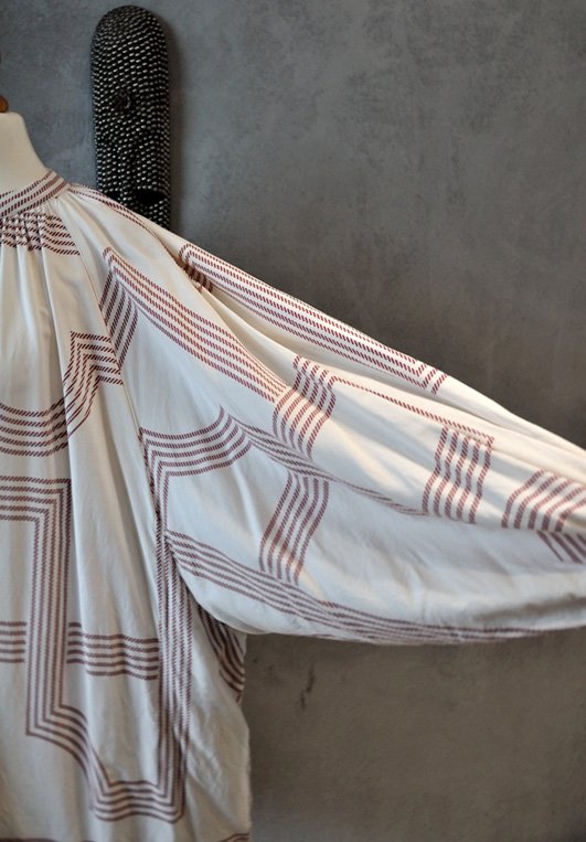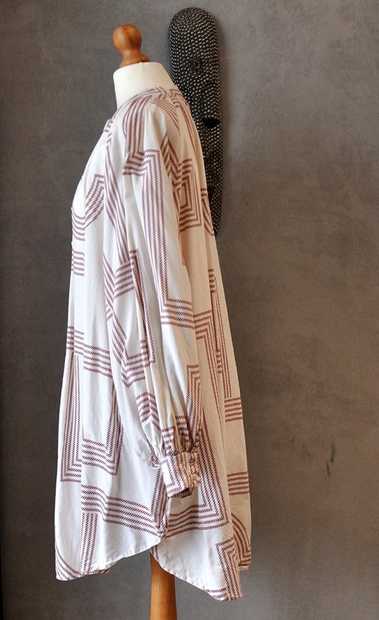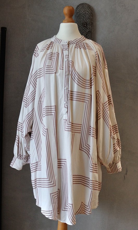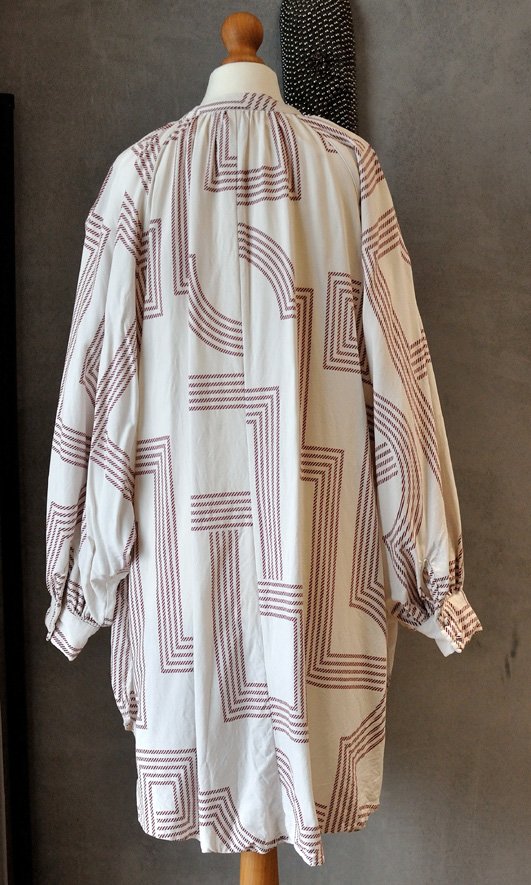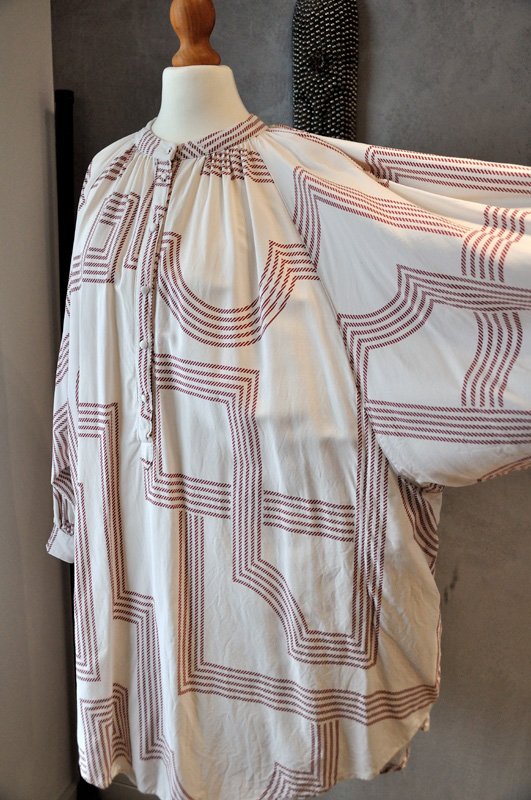 Uszyta z kremowo białej, średniej grubości wiskozy w ciemnoczerwony geometryczny print.