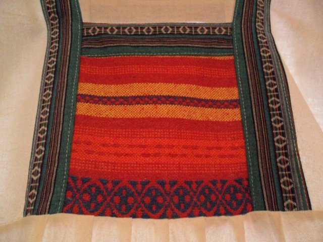 Etniczna sukienka z mlecznobiałego lnu z elementami ozdobnymi wykonanymi prawdopodobnie z tkanej wełny lub bawełny. Kolory elementów ozdobnych to: czerwień, bordo, zieleń, granat, fiolet, czerń, żółty... Zdjęcia nie oddają ich intensywność (a są intensywne). Sukienka ma dekolt karo i jest odcinana nieznacznie poniżej biustu, a od tego miejsca jest luźno puszczona. Tuż pod biustem i z tyłu ma kilka zaszewek, dzięki czemu ładnie się układa. Ten model sukienki powinien leżeć na figurze dość luźno, wtedy uzyskuje się najlepszy efekt stylistyczny. Dużą zaletą sukienki jest to, że ukrywa ewentualne niedoskonałości figury. Sukienka świetnie nadaje się także na okres ciąży.