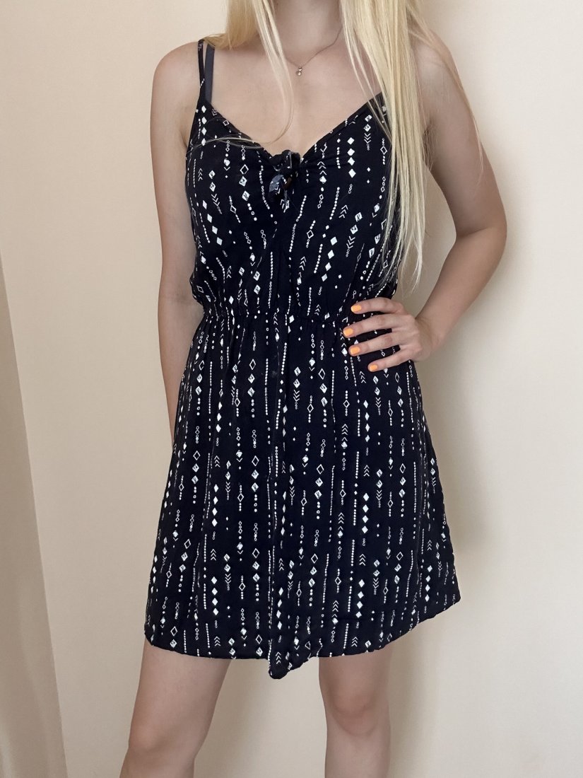 Krótka sukienka z wiskozowej tkaniny na wąskich regulowanych ramiączkach. Dekolt w serek, wiązanie z przodu, elastyczne odcięcie w talii. Bez podszewki.