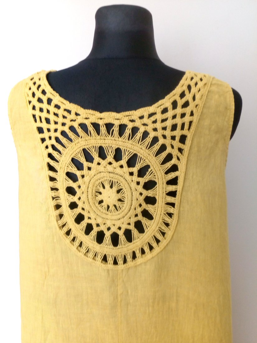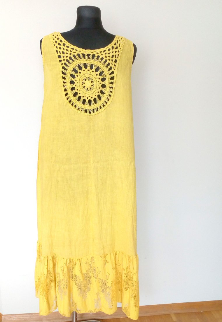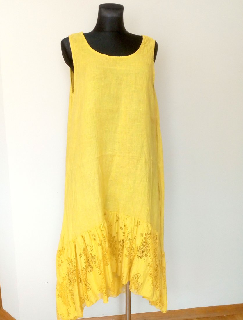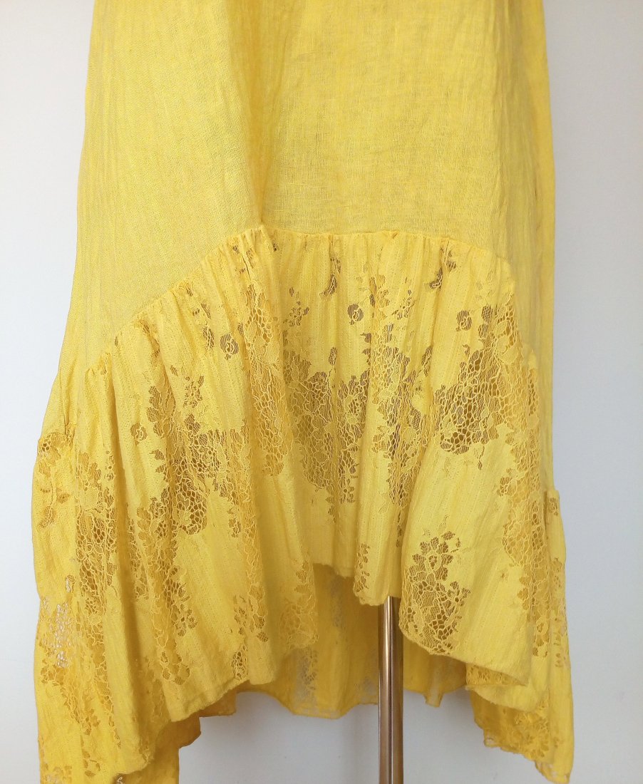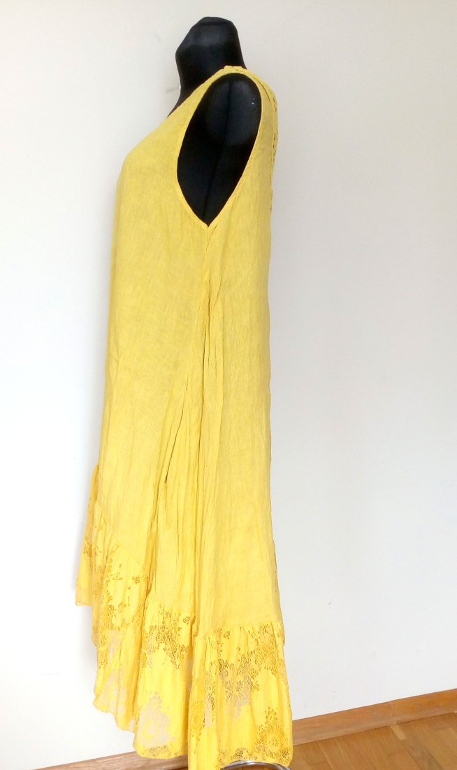 Lniana sukienka w żółtym kolorze, asymetryczna - krótszy przód, w szwach bocznych wpuszczane kieszenie, u dołu szeroka, koronkowa falbana
