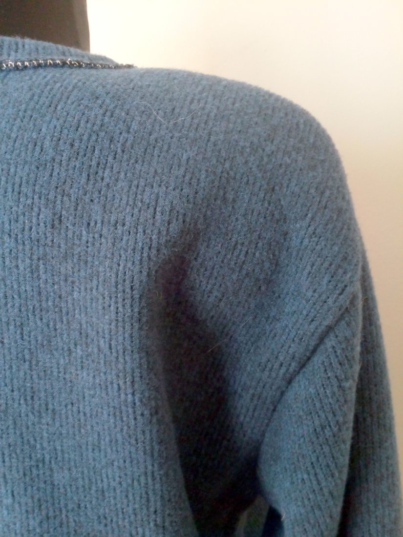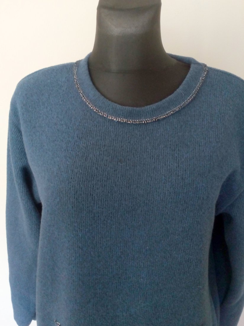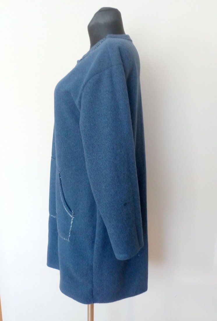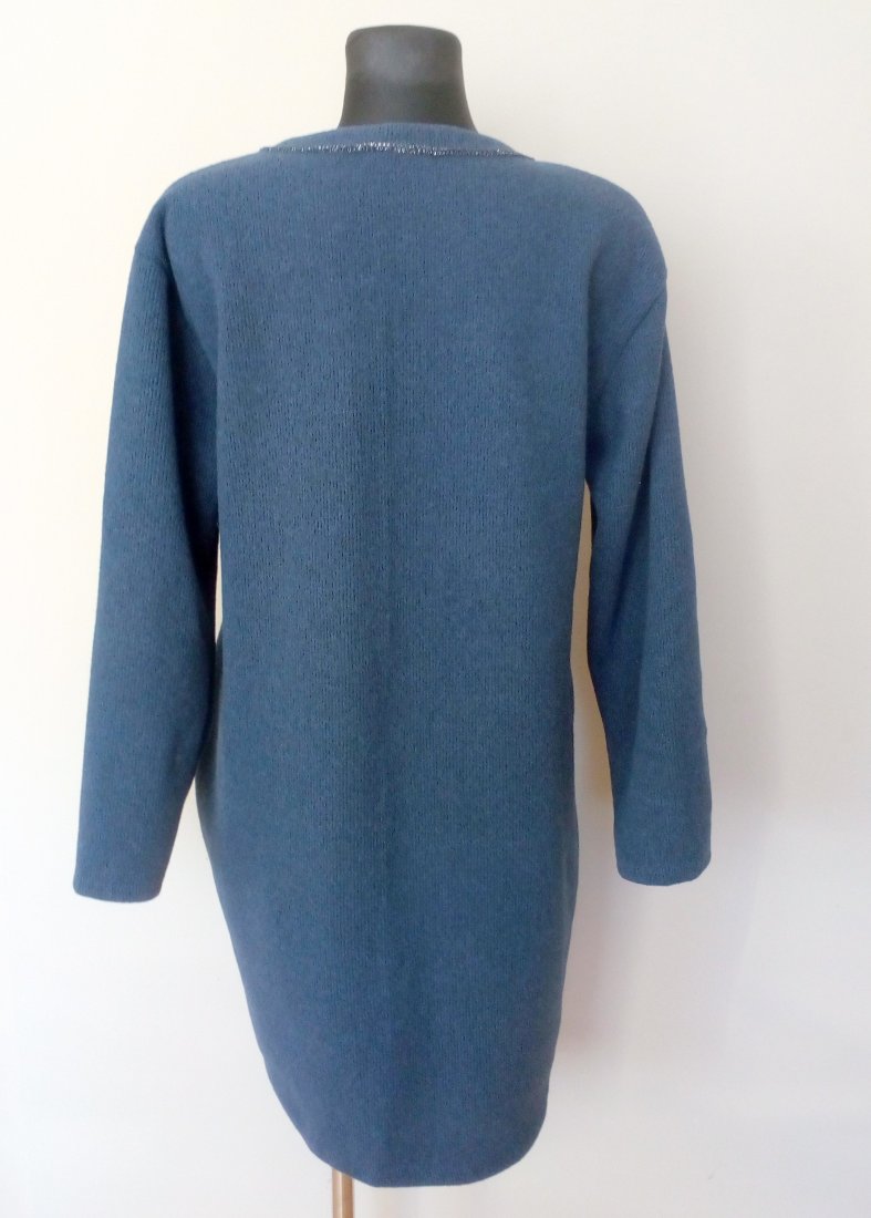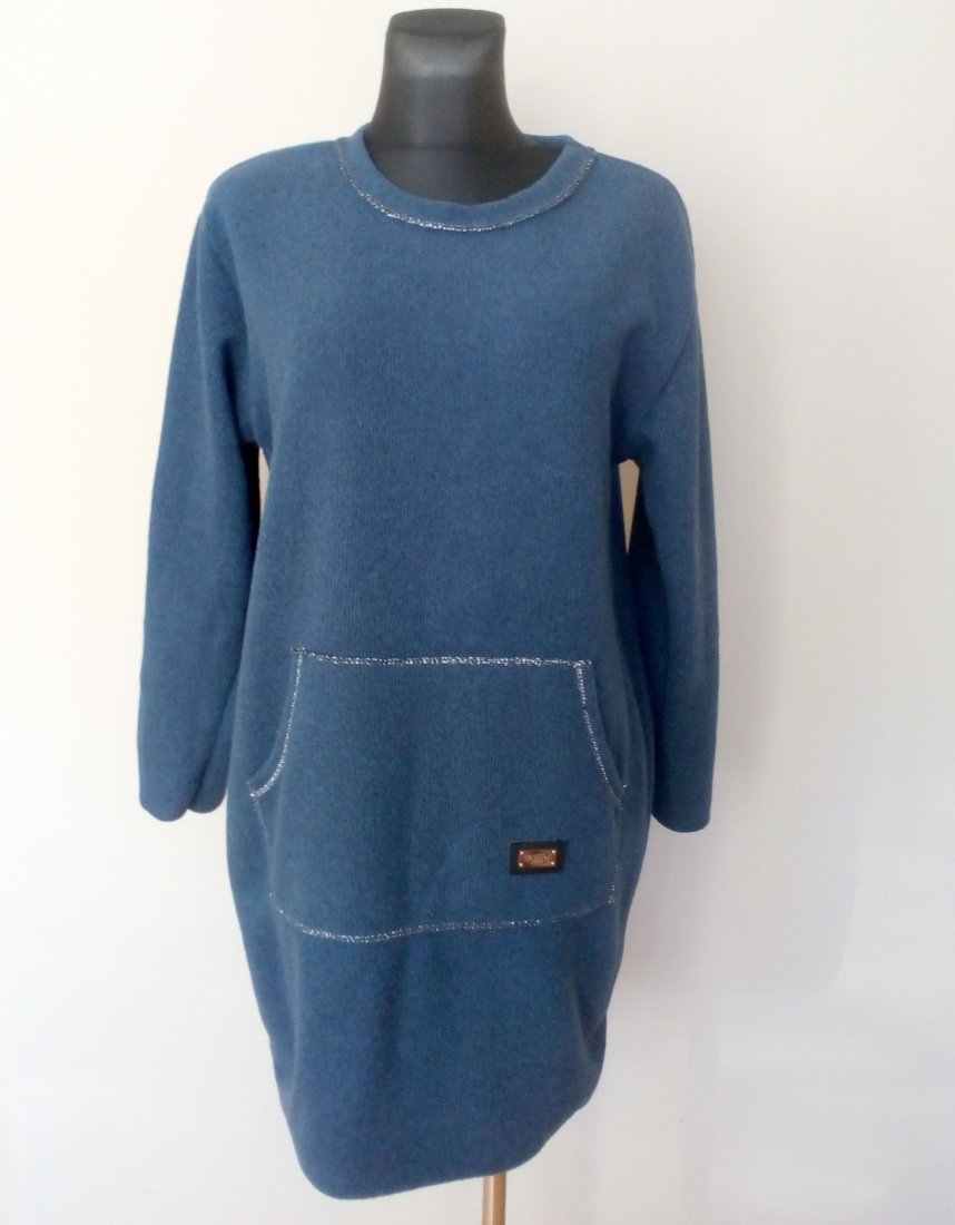 Ciemnoniebieska sukienka z tęgiej, podatnej dzianiny z fakturą w prążki, dekolt okrągły, z przodu naszyta kangurowa kieszeń, listwa dekoltu i brzegi kieszeni obrzucone metaliczną nitką w srebrnym kolorze, rękawy obniżane, sukienka dobrze trzyma fason