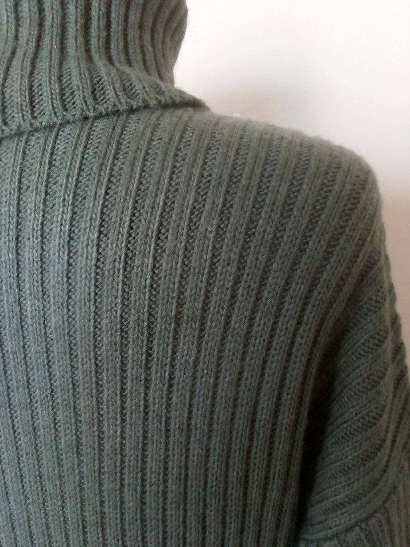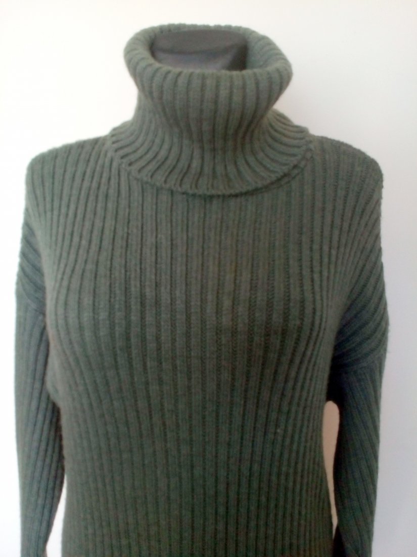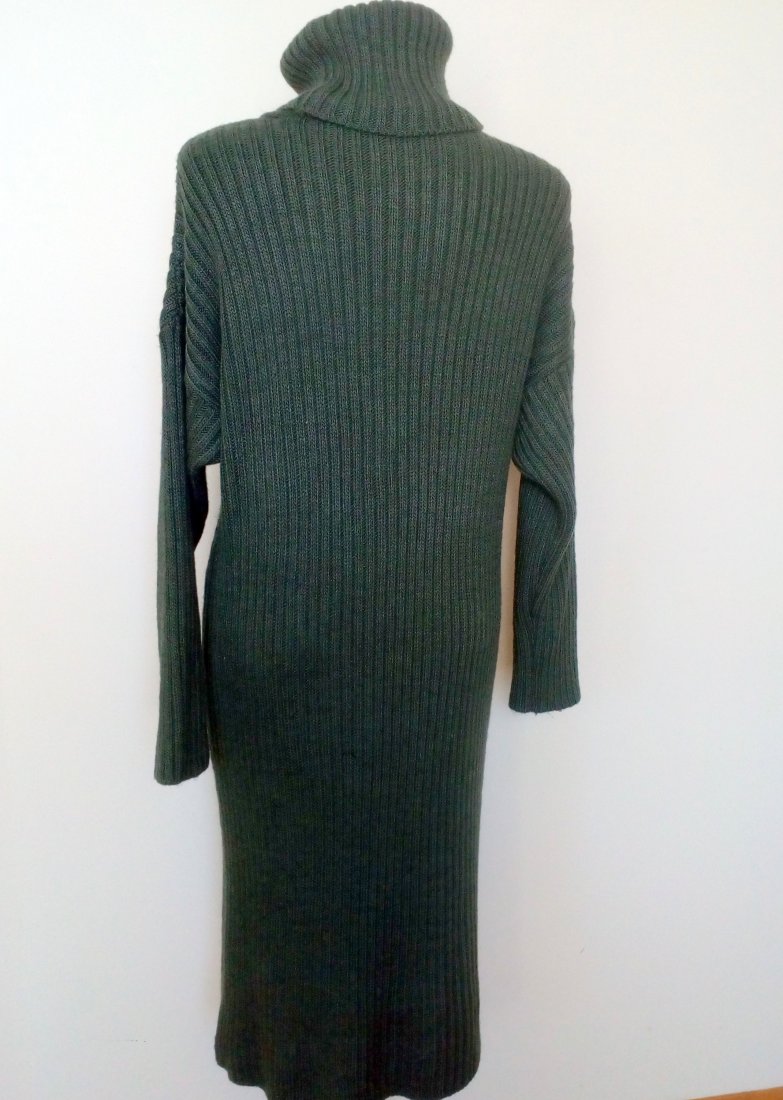 Miła, swetrowa sukienka w ładnym ciemnozielonym kolorze, wykonana ściegiem ściągaczowym, pod szyją odwijany golf, u dołu, po bokach rozcinana, rękawy obniżane