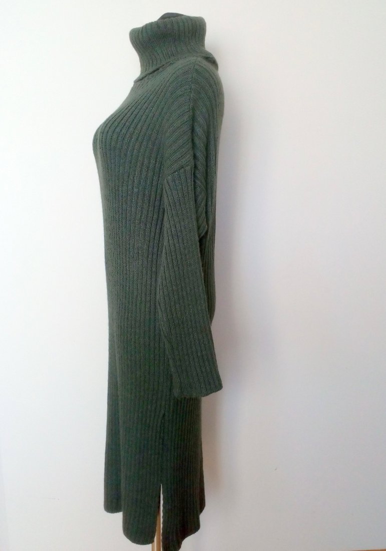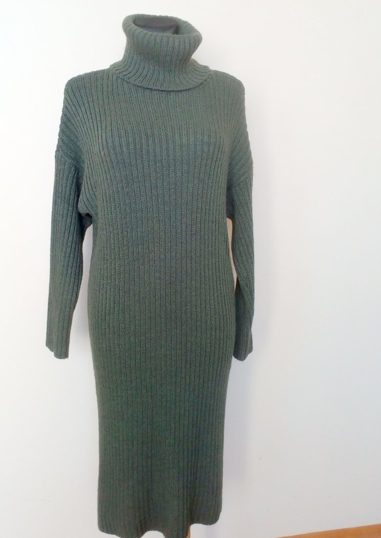 Miła, swetrowa sukienka w ładnym ciemnozielonym kolorze, wykonana ściegiem ściągaczowym, pod szyją odwijany golf, u dołu, po bokach rozcinana, rękawy obniżane