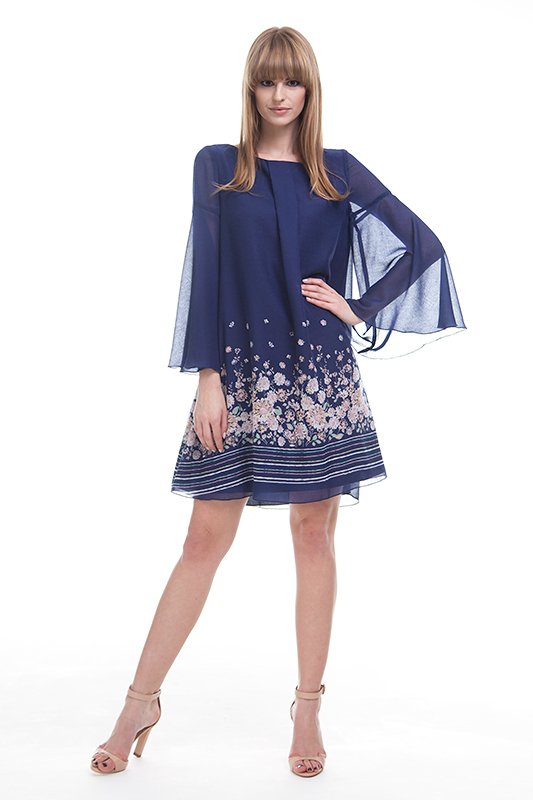 Sukienka uszyta z cienkiej włoskiej bawełny kolorze granatowym z motywem kwiatów, na podszewce. Tkanina jest bardzo lekka. Fason z luźną talią i biodrami, poszerzony na dole, ozdobne listwy na przodzie i tyle. Rękawy rozkloszowane, delikatne wykończenie, długość około 95 cm. Polecam.