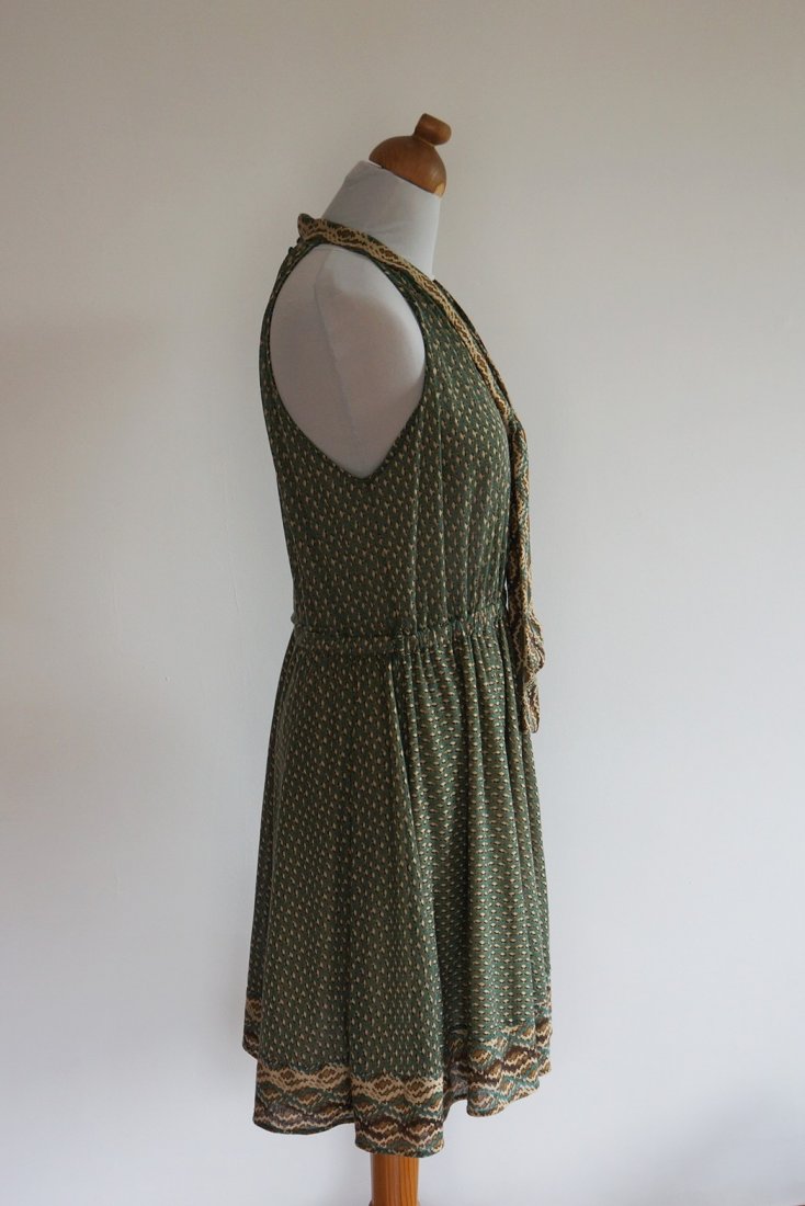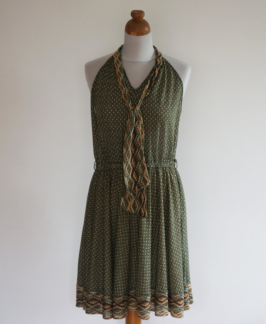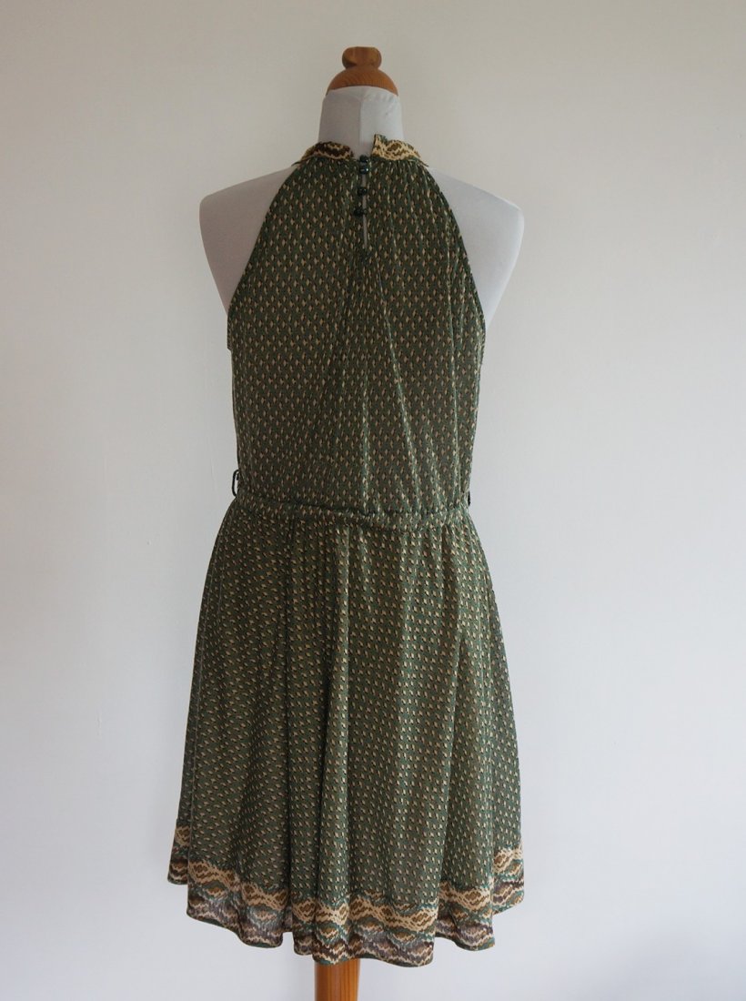 Letnia sukienka , odcinana w pasie. Z tyłu zapinana na 4 guziki. Przy szyi wykończona plisą przechodzącą w dwa pasy materiału. . Spódnica cała na podszewce. Materiał 100% poliester. Stan dobry /brak paska/,