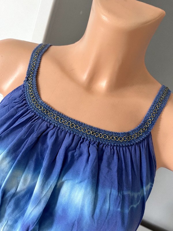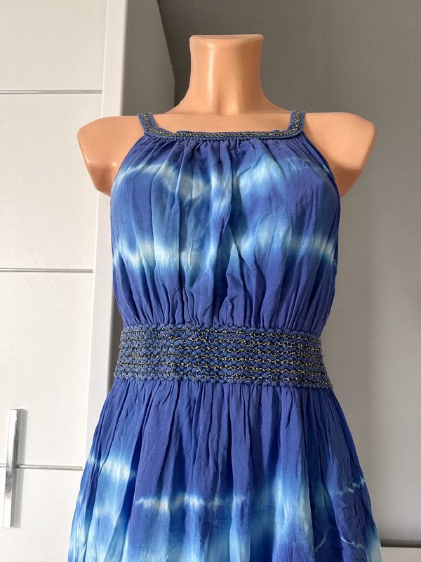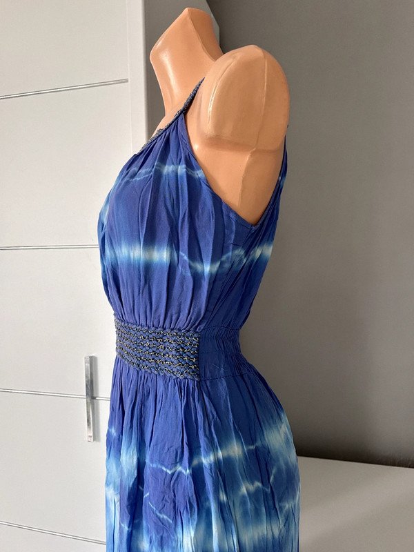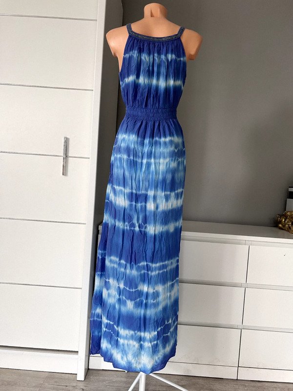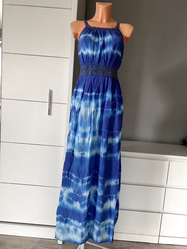 Sukienka włoska 100 % wiskoza, a więc przewiewna, idealna na lato i upały. Maxi do kostek, w pasie gumka przez co bardzo ładnie dopasowuje się i podkreśla talię. W pięknym niebieskim kolorze. Nie posiada metki z rozmiarem ale moim zdaniem jest to rozmiar S/M. Polecam ????