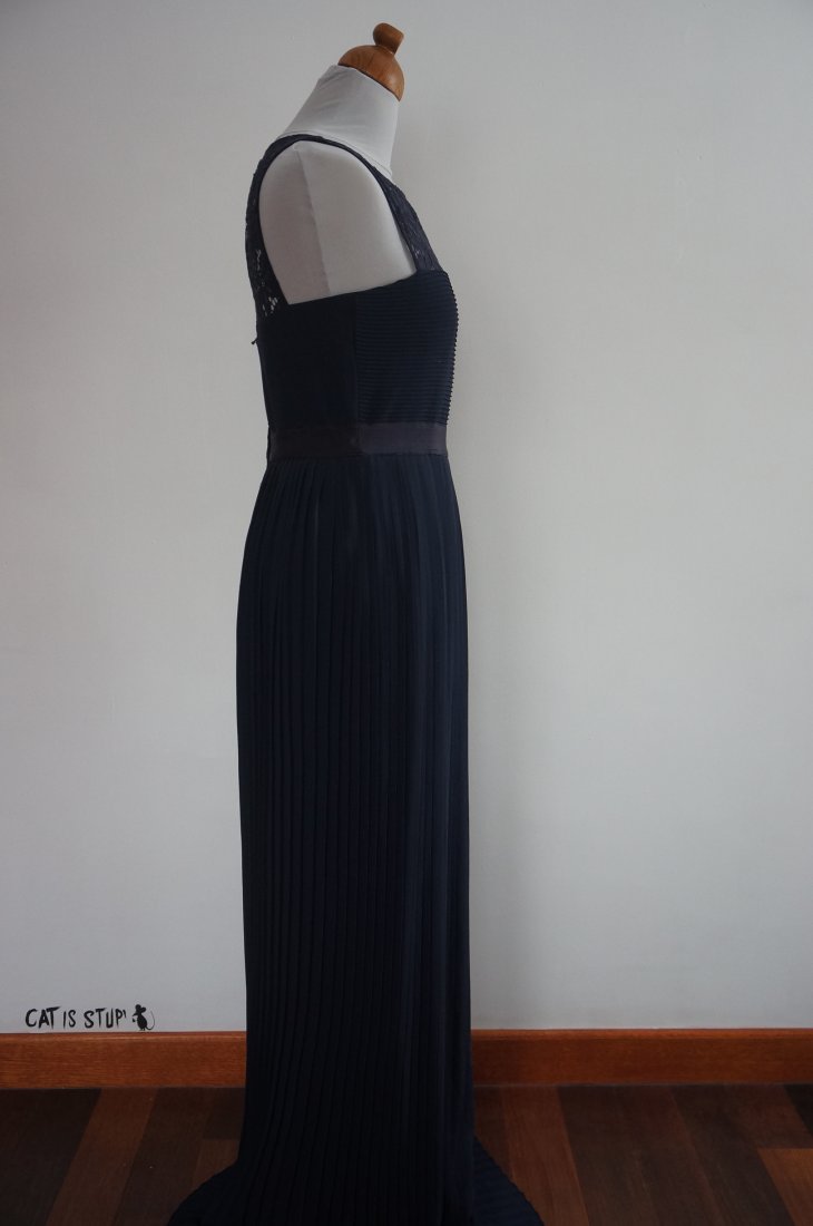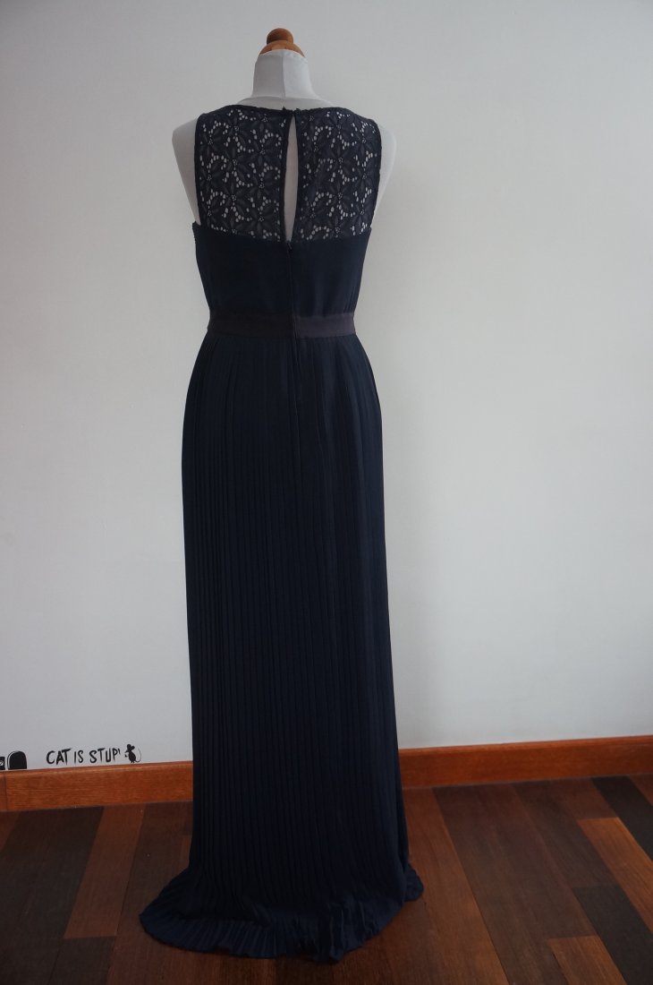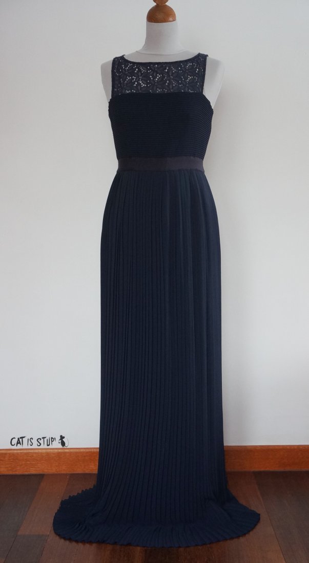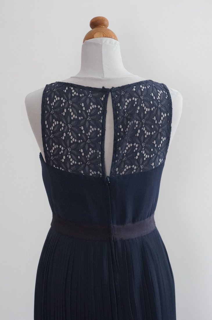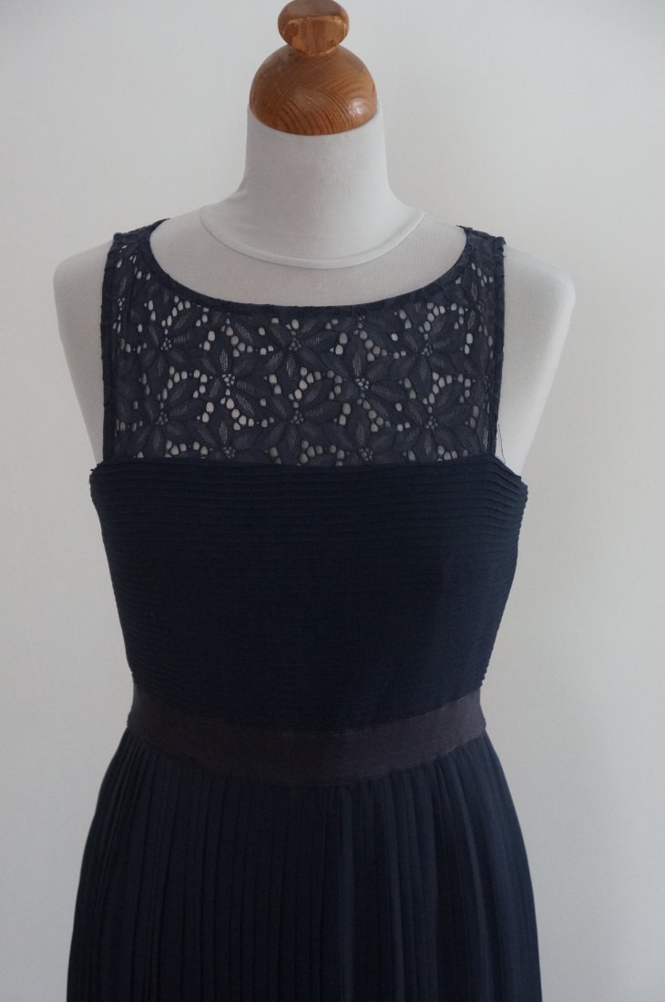 Elegancka sukienka maxi bez rękawów. Karczek z koronki.. Spódnica plisowana, cała na podszewce. Z tyłu zamek długości 35 cm.