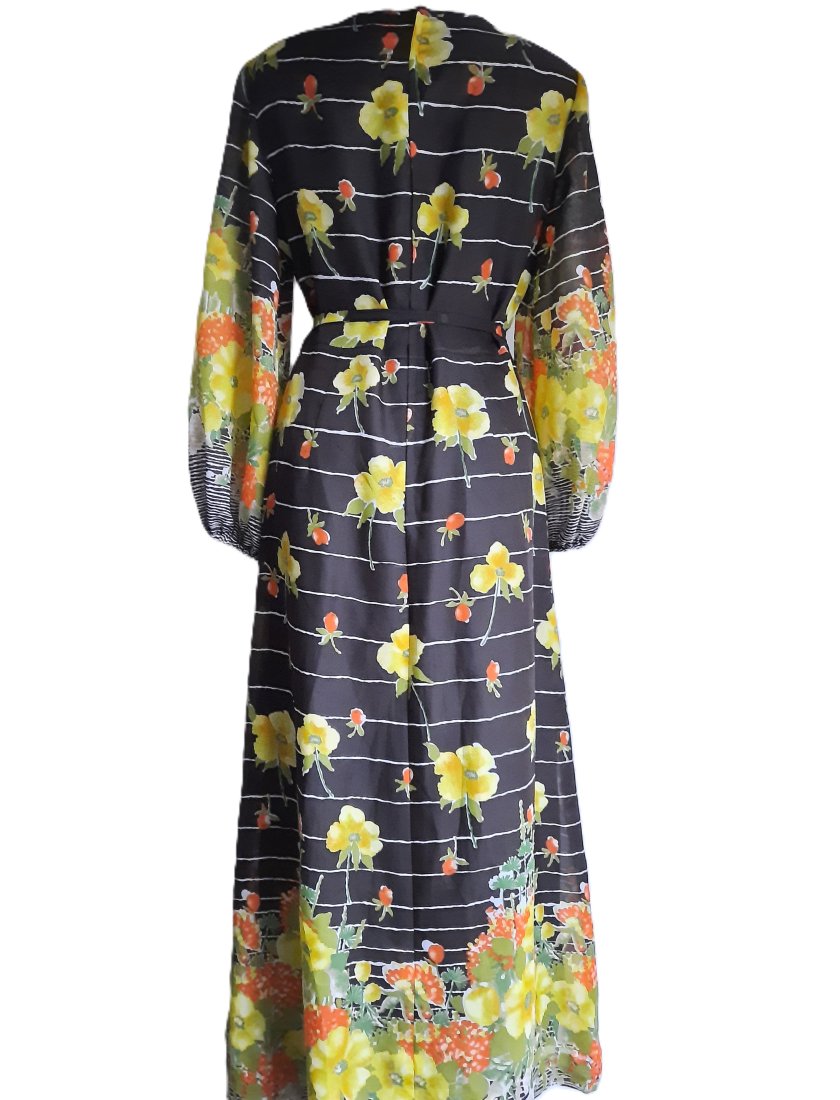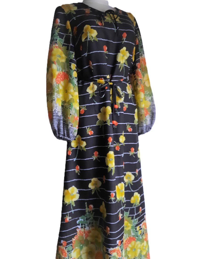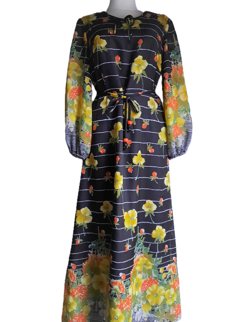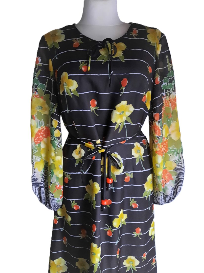 piękna długa sukienka vintage z lat 70-tych, w kolorze czekoladowego brązu w kolorowe kwiaty oraz poziome paski, długi, szeroki, lekko prześwitujący rękaw ściągany gumką, pod szyją wiązanie, w pasie odcinana, na podszewce, z tyłu zapinana na suwak i haftkę, w komplecie materiałowy pasek zdobiony drewnianymi kulkami, brak metki z rozmiarem