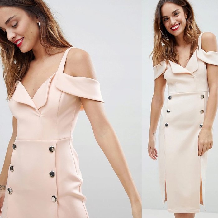 Sukienka ołówkowa z oryginalnym topem na ramiączkach, w kolorze rozbielonego łososiowego beżu. Góra wykończona wykładaną plisą, dół ołówkowy z podwójnym rozporkiem z przodu, wykończony metalowymi guzikami. Całość lekko elastyczna, ładnie podkreśla figurę nie krępując ruchu. Sukienka bez podszewki.