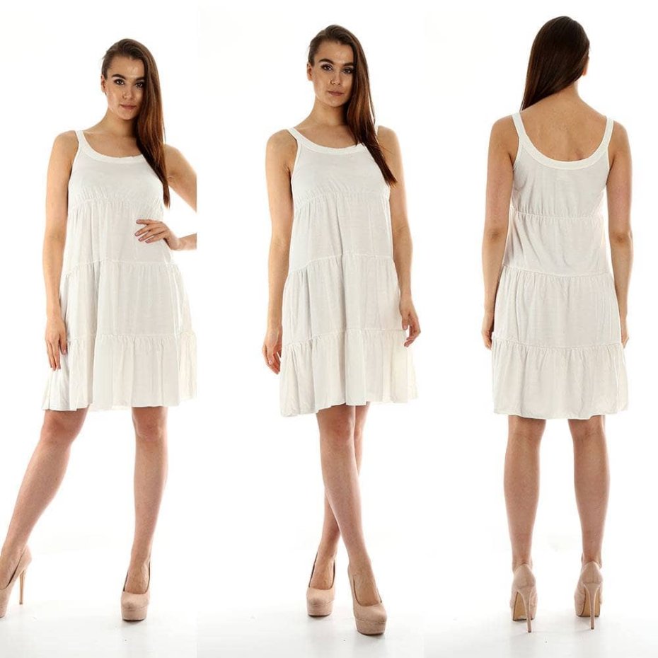 Letnia sukienka wykonana z lejącej się lekkiej tkaniny typu jersey. Krój w kształcie litery A rozszerzany ku dołowi. Grubsze stabilne ramiączka. Szyta z kilku namarszczanych falban. Dostępna w kilku kolorach. Idealna na wiosnę , lato.