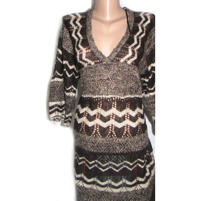 Niezwykle ozdobna i ciekawa tunika o kroju A z połyskującej dzianiny, jak robiona na drutach, z pięknym koronkowym wykończeniem, ze połyskującą nitką, z głębokim dekoltem i kimonowymi rękawami, odcinana pod biustem i rozszerzana ku dołowi, Bardzo kobieca. Prosty dekolt w serek bardzo głęboki (również na plecach) Wymiary na płasko: biust 44 cm, talia 39 cm, biodra 45 cm. Długość tuniki mierzona tyłem od ramienia do dołu 94 cm, długość rękawa mierzona po zewnętrznej stronie od szyi 53 cm.