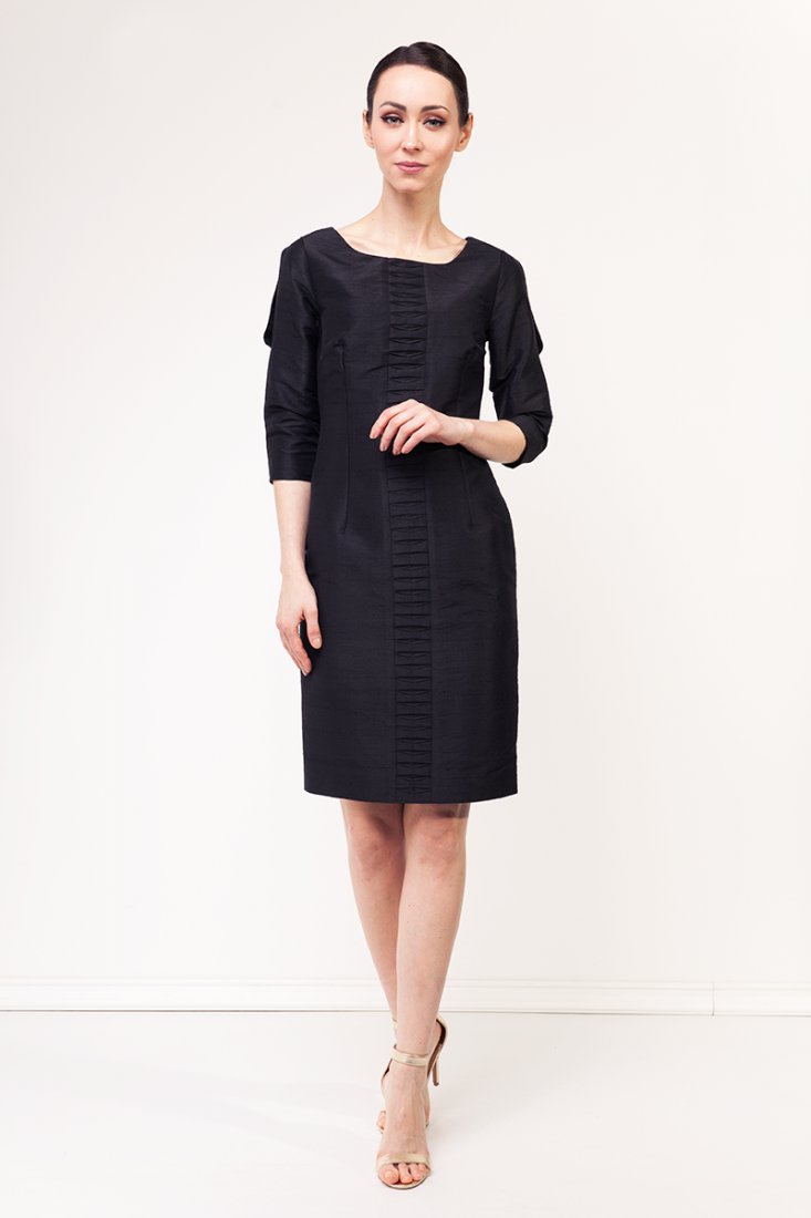 Ekskluzywna sukienka z kolekcji specjalnej uszytej na tajski tydzień mody. Wykonana z tajskiego, ręcznie tkanego jedwabiu królewskiego. Tkanina nie jest elastyczna. Fason ołówkowy dopasowany zaszewkami, na wiskozowej podszewce. Po środku ozdobna aplikacja wykonana ręcznie, rękawy 3/4 z pęknięciami na górze, zamek kryty z tyłu, długość około 100 cm.