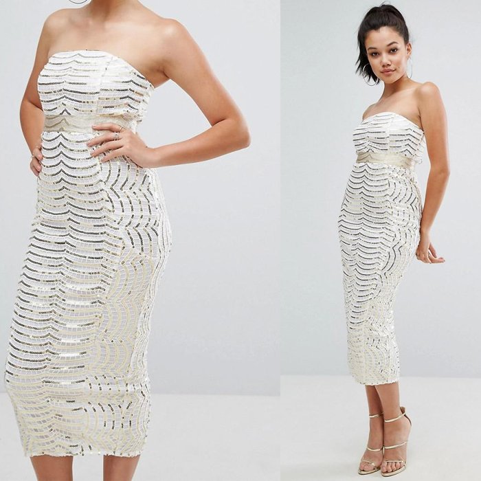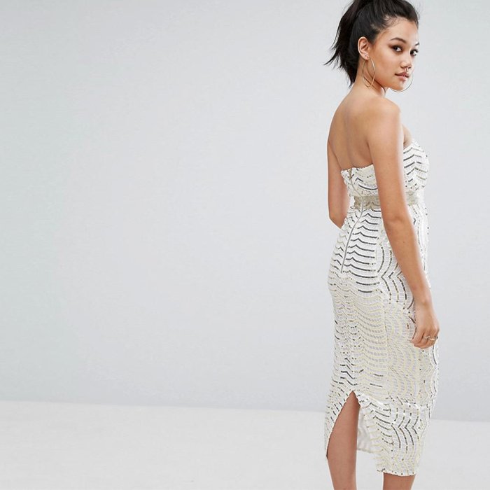 Sukienka ołówkowa tuba, glamour. Dopasowana w biuście, w talii zebrana siateczkowym paskiem, z tyłu zapięcie na metalowy zamek. Elegancki model na wyjątkową okazję, podkreślający kobiece atuty figury. Sukienka wykonana z koronkowej gipiury w kolorze ecru, obszytej złotymi cekinami we wzór nawiązujący do art deco. Sukienka na podszewce. Gorsetowy top jest stabilny, wykończony taśmą sylikonową zabezpieczającą przed zsuwaniem. Dodatkowo dołączone odczepiane ramiączka. Całość lekko elastyczna.