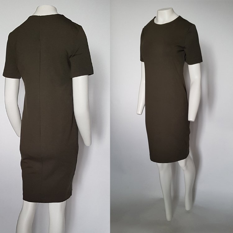 Sukienka ołówkowa z grubej dzianiny wiskozowej, w kolorze zieleni khaki. Długość za kolano, dekolt okrągły, rękawy krótkie.
