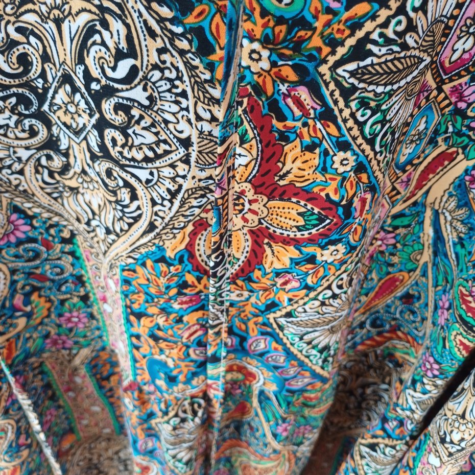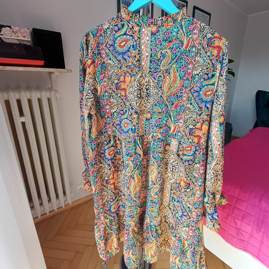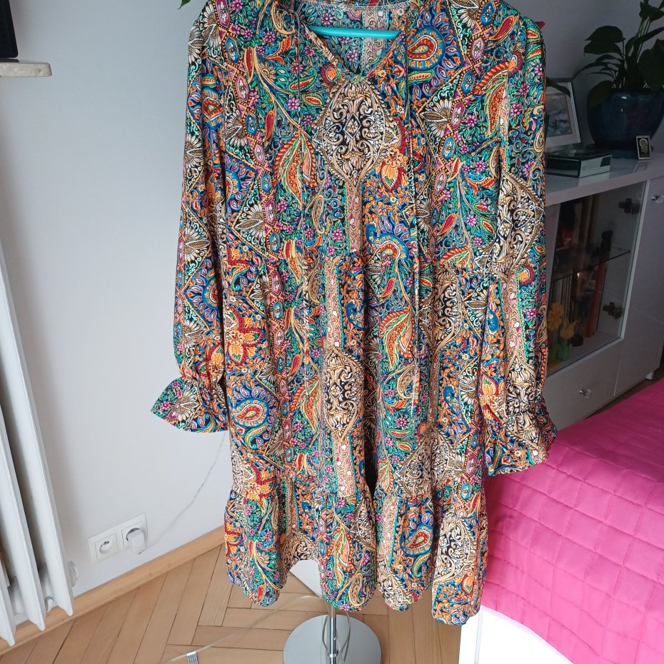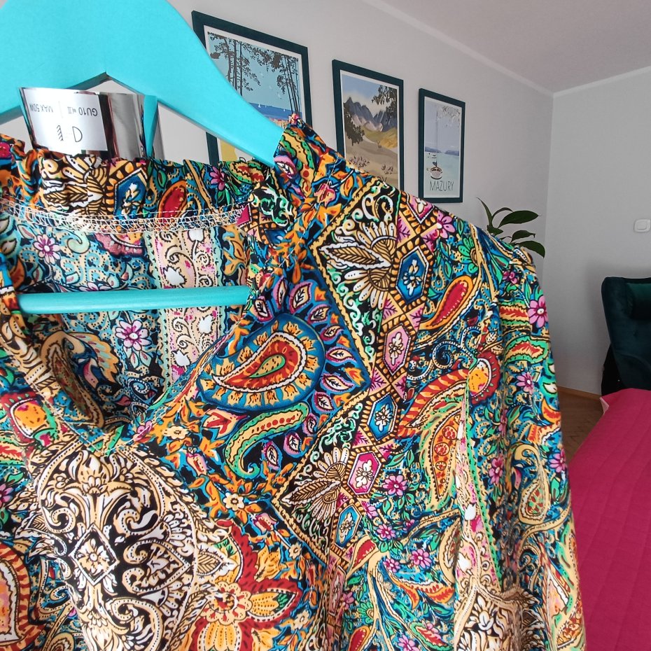 Cudna sukienka oversize. Wyraziste (w rzeczywistości bardziej nasycone,drugie zdjęcie) wiosenno letnie kolory we wzorze paisley. Przy szyi falbanka z wiązaniem,rękaw z gumką,rozkloszowany. W ramionach delikatne marszczenia. Rozkloszowany fason z falbanami zapewnia komfort noszenia. Cienki, miły w dotyku materiał.