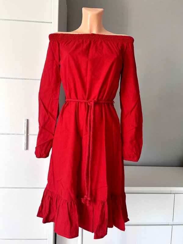 Sukienka firmy Esmara, 55 % len, 45 % bawełna czyli przewiewna, idealna na lato, rozmiar S. Hiszpanka, odkryte ramiona, wiązana w pasie przez co podkreśla talię. Na dole falbanka, kobieca, seksowna. Polecam