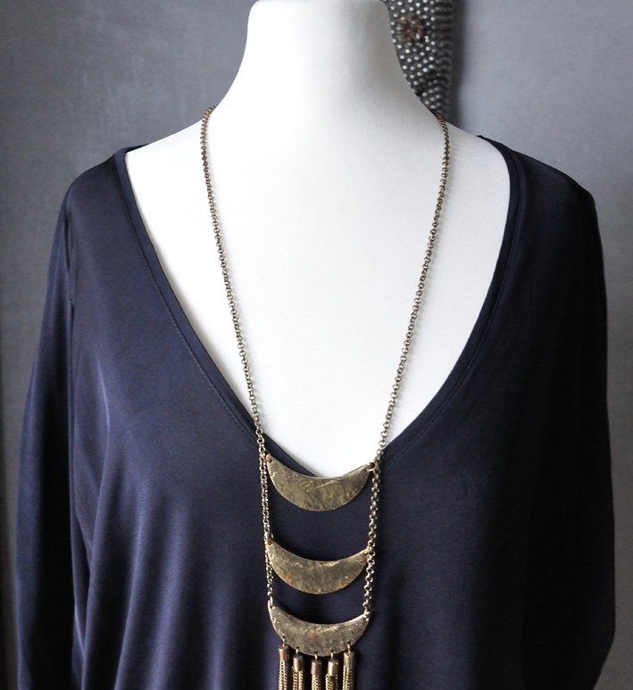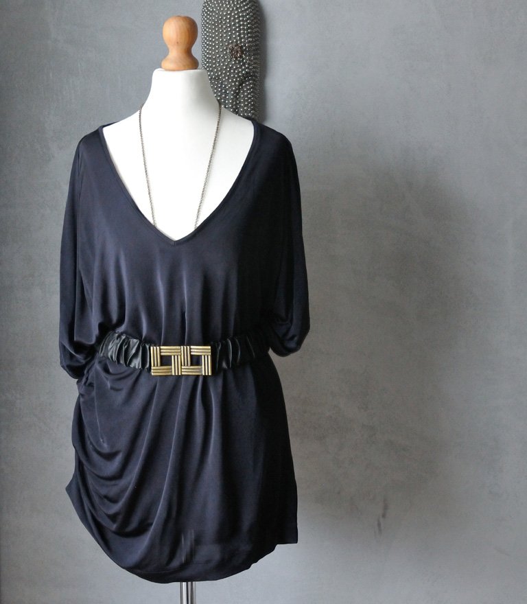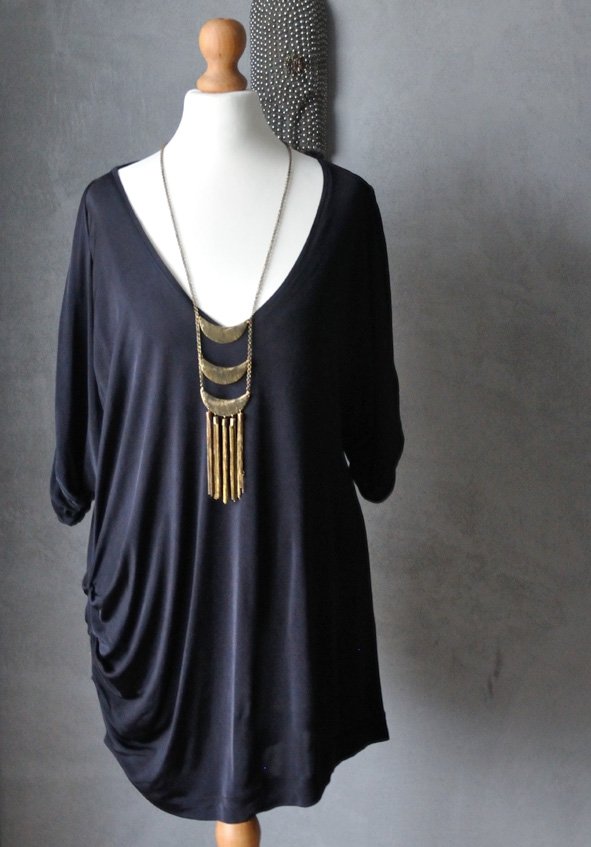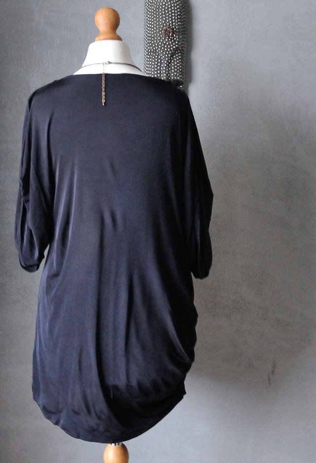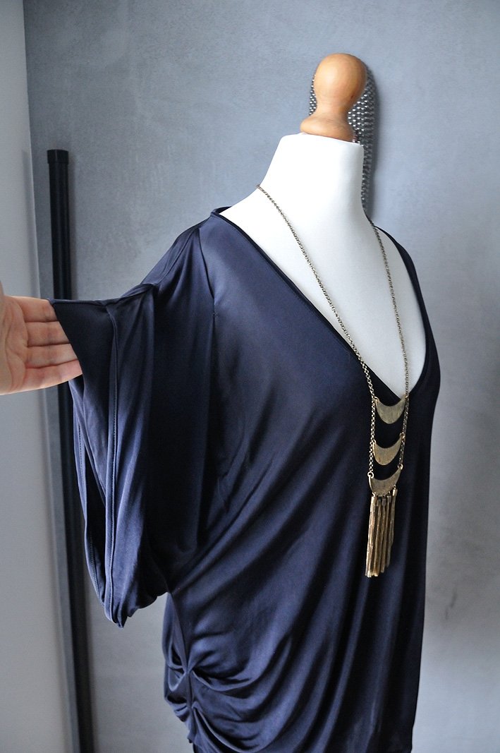 Uszyta z czarnej, miękkiej lejącej tkaniny wiskozowej. Tkanina śliska, nieco prześwitująca. Duży, trójkątny dekolt. Krój nietoperz. Rękawy pozawijane i udrapowane. Na prawym biodrze też drapowanie. Czerń jest pełna i głęboka, materiał odrobinę połyskuje ( ma taki subtelny, satynowy połysk).