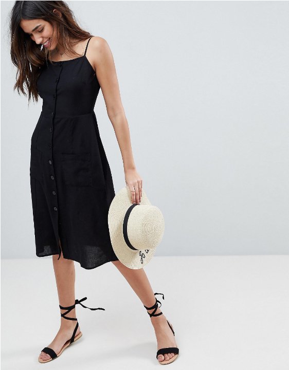 Naturalna, przewiewna sukienka za kolano, idealna na upalne lato. Sukienka na cienkich, regulowanych ramiączkach, z przodu na wysokości bioder dwie kieszenie nakładane, na całej długości zapinana na guziki, odcięta w talii, dół lekko rozszerzany. Sukienka bez podszewki, tkanina o luźnym, lnianym splocie. Idealna na co dzień, na wakacyjny wyjazd, na plażę, do ogrodu etc.