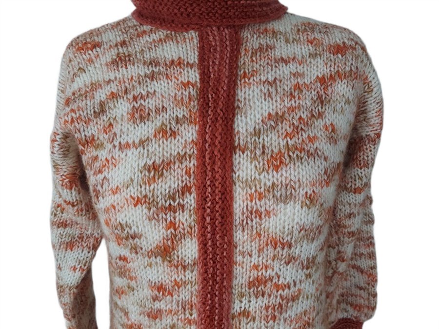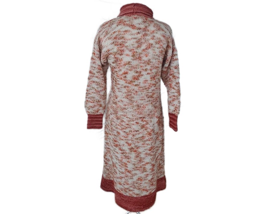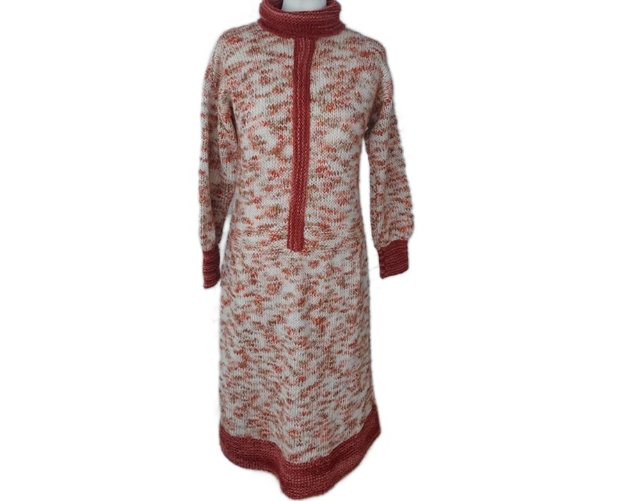 Wyjątkowy okaz rękodzielniczy. Sukienka robiona na drutach, idealna dla miłośniczek noszenia sukienek zimą. Utrzymana w odcieniach bordo, beżu i rudości.