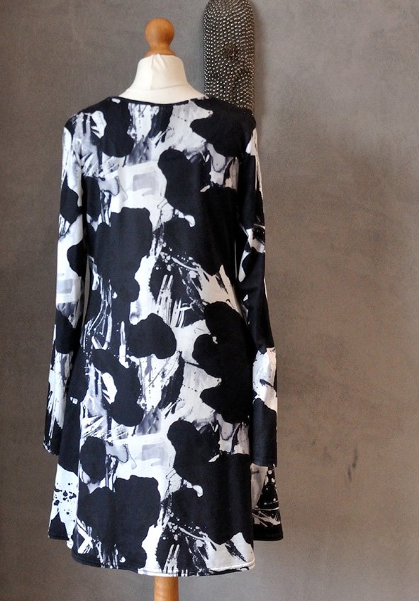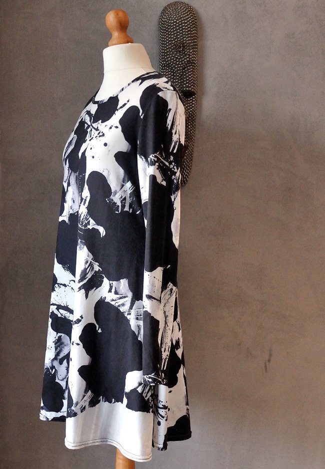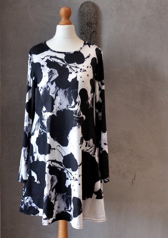 Mocno rozkloszowana, krótka, ze średniej wielkości okrągłym dekoltem. Fason luźniejszy, niezbyt dopasowany w talii, mocno rozszerza się ku dołowi.