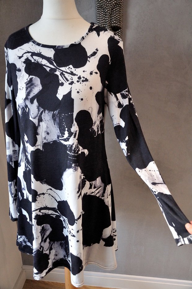 Mocno rozkloszowana, krótka, ze średniej wielkości okrągłym dekoltem. Fason luźniejszy, niezbyt dopasowany w talii, mocno rozszerza się ku dołowi.