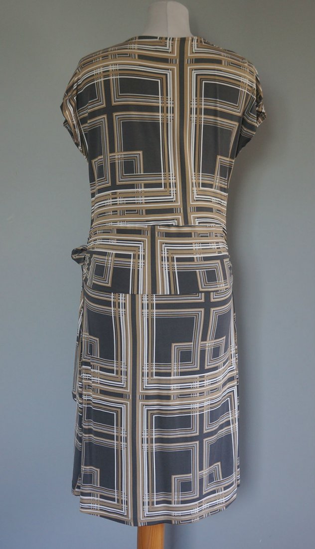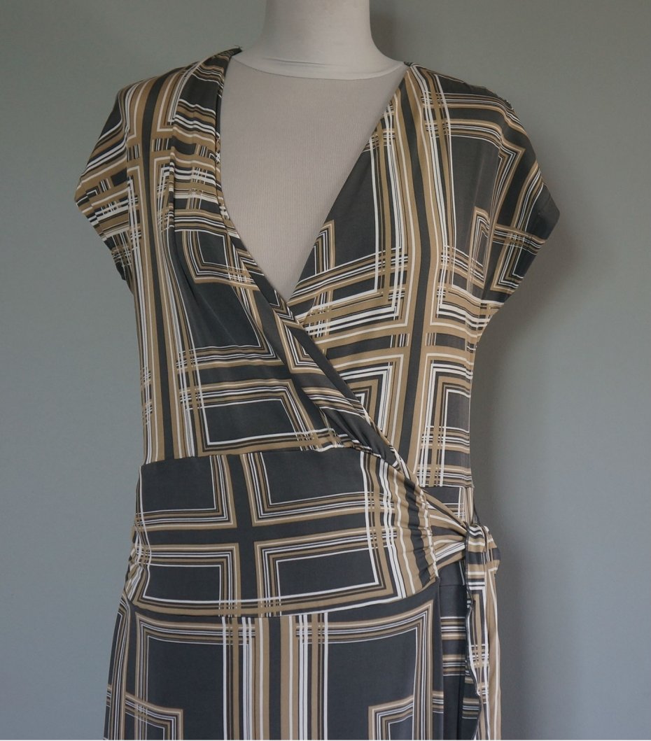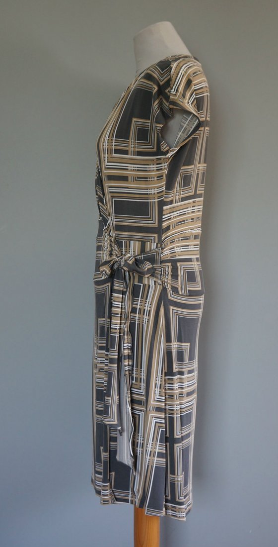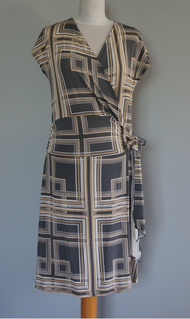 Sukienka marki Selection by s. Oliver. Ładna, stonowana kolorystyka. Głęboki dekolt. Wiązana w pasie. Tkanina elastyczna - metka wycięta. Rękawki lekko opadające. Stan dobry.