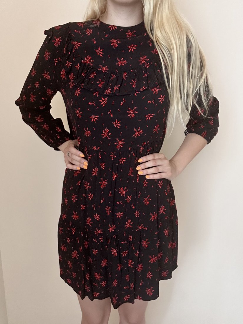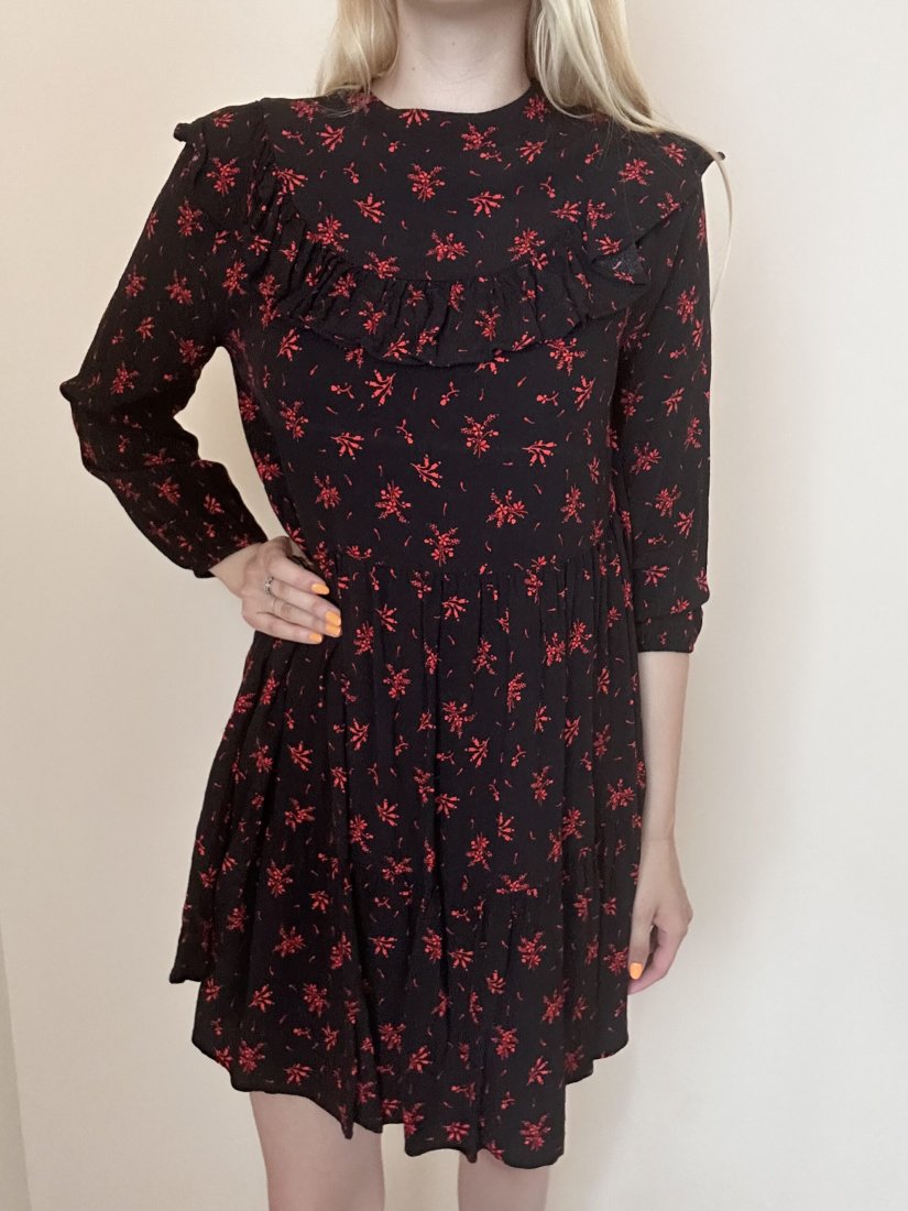 Czarna sukienka z Zary, posiada kołnierz z przodu i z tyłu. Łatwo się ją zakłada, ponieważ z tylu posiada zamek. Jest luźna. Rozmiar z metki to S 36.