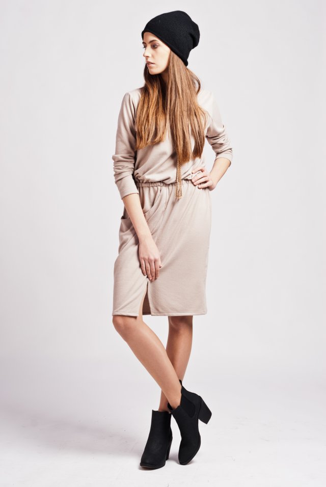 Casualowa propozycja dla kobiet, które lubią czuć się swobodnie, nie rezygnując z kobiecego wyglądu. Sukienka o ciekawym, asymetrycznym kroju, z rozcięciem na dole i kieszenią na biodrze jest zarówno wygodna, jak i oryginalna. Pasuje do każdego typu obuwia, od klapek, poprzez sandały, czółenka, botki, aż po sportowe sneakersy.