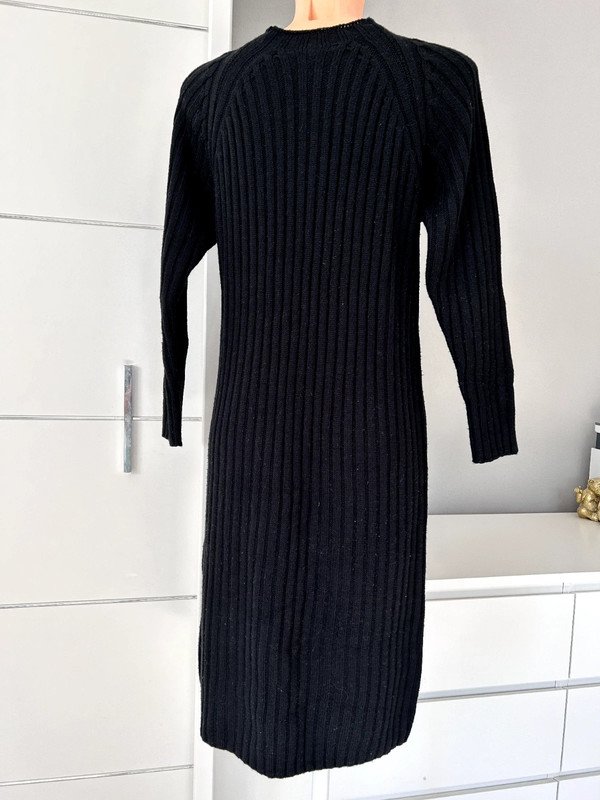 Sukienka swetrowa czarna, w prążek. Ciepła, zimowa. Nie posiada metek ze składem i rozmiarem, według mnie jest to rozmiar S. Polecam