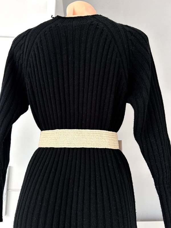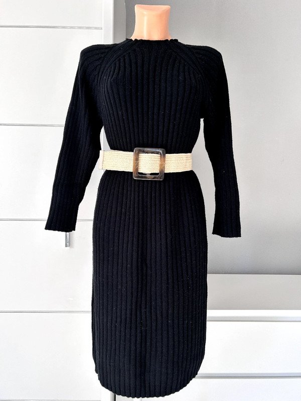 Sukienka swetrowa czarna, w prążek. Ciepła, zimowa. Nie posiada metek ze składem i rozmiarem, według mnie jest to rozmiar S. Polecam