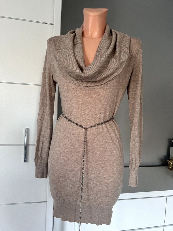 Sukienka swetrowa tunika firmy H&M, nie posiadam metki z rozmiarem ale moim zdaniem to rozmiar S 36. Kolor beżowy, 61 % wiskoza, a więc przewiewna. Luźny golf, ściągacze przy rękawach i na dole, elastyczna, wygodna. Polecam. Pasek nie jest w komplecie.