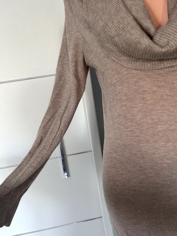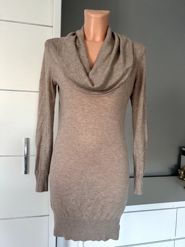 Sukienka swetrowa tunika firmy H&M, nie posiadam metki z rozmiarem ale moim zdaniem to rozmiar S 36. Kolor beżowy, 61 % wiskoza, a więc przewiewna. Luźny golf, ściągacze przy rękawach i na dole, elastyczna, wygodna. Polecam. Pasek nie jest w komplecie.