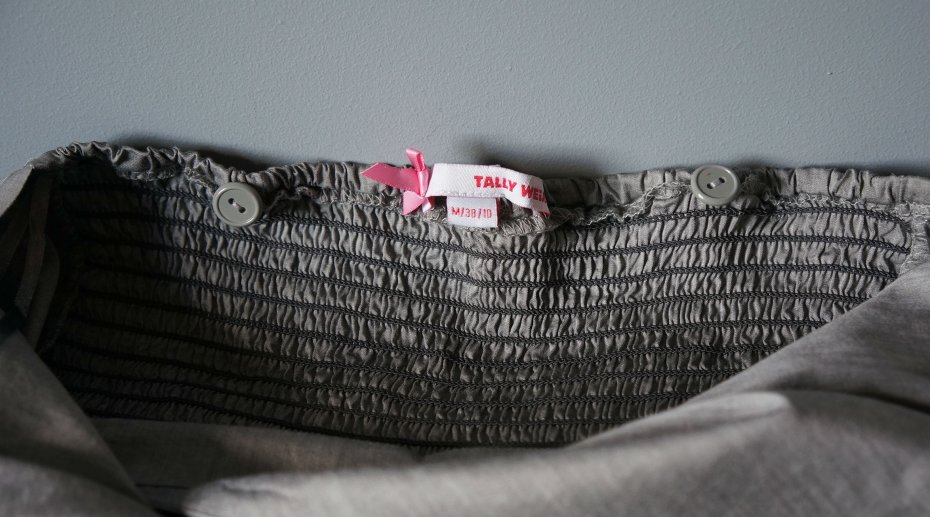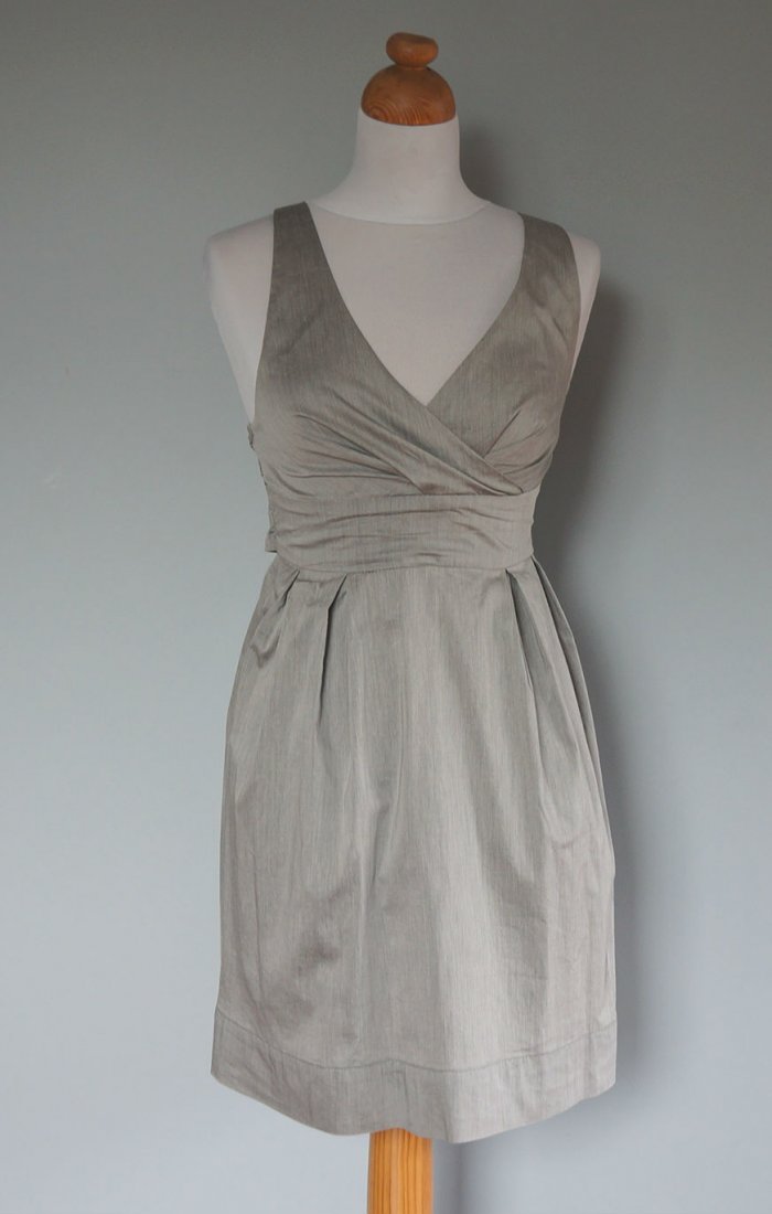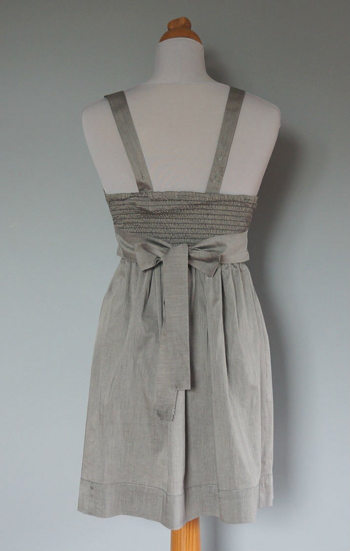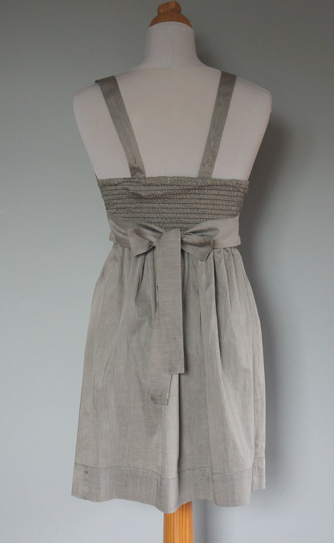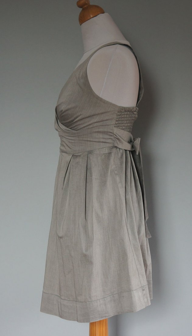 Letnia sukienka marki Tally Weijl. Kolor szary. Odcinana pod biustem. Na plecach gumeczki i szarfa do wiązania. Sukienkę można wiązać na szyi lub nosić na szeleczkach zapinanych na guziki. Skład: 66% bawełna, 29% nylon, 5% elastan. Stan bardzo dobry.