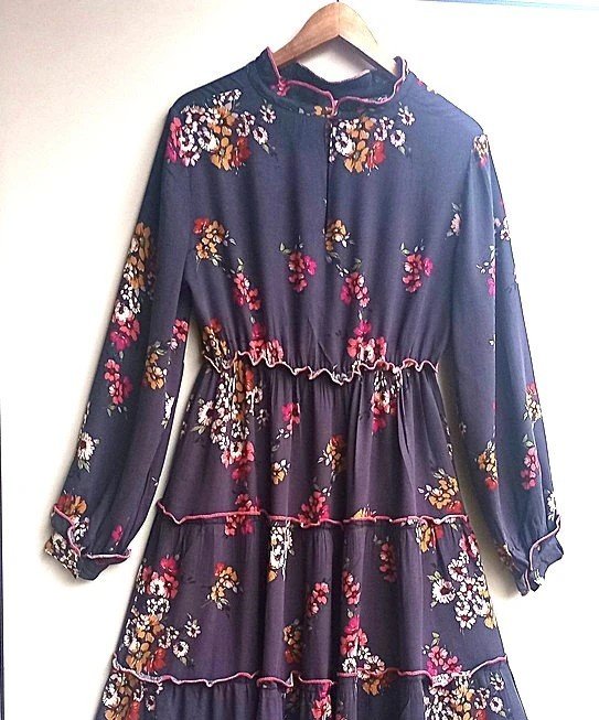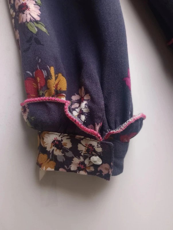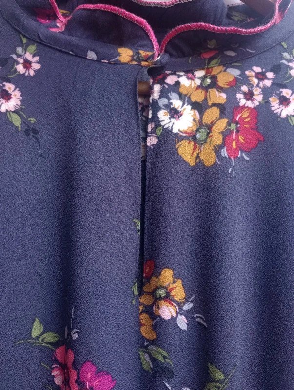 Sukienka true vintage. Na granatowym tle kwiecisty wzór. Zdjęcia trochę przekłamują kolorystykę. W rzeczywistości jest ona bardziej zgaszona. Nawet tło granatowe jest stonowane i jakby wymieszane z antracytową szarością. Najbliższy rzeczywistości jest kolor pokazany na ostatnim zdjęciu (na przykładzie rękawa). Pod szyją sukienka jest rozcięta z możliwością zapinania na metalowy guzik. Rękawy w nadgarstku także są zapinane na metalowy guzik. Rękawy są dość szerokie. Więcej zdjęć sukienki można zobaczyć tutaj: https://www.vinted.pl/items/5953877706-kardigan-tunika-plaszcz-spodnica-perfumy-bluzka-buty-ponczo-torba-szal-peleryna-koszula