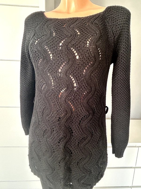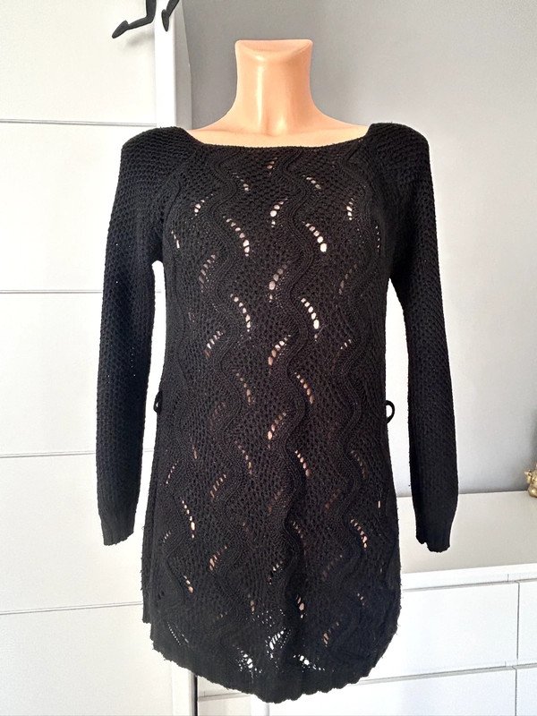 Sukienka tunika długi sweterek ażurowy w kolorze czarnym. Nie ma metki z rozmiarem ale według mnie jest to rozmiar M 38. Dekolt łódka, w pasie szlufki na pasek, 50% wełny