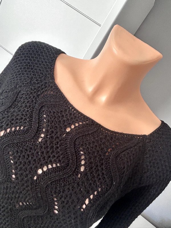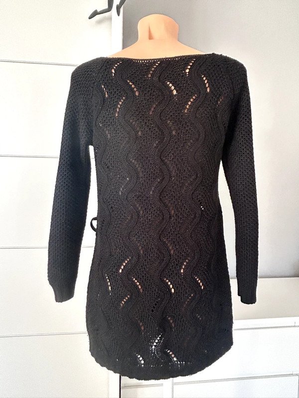 Sukienka tunika długi sweterek ażurowy w kolorze czarnym. Nie ma metki z rozmiarem ale według mnie jest to rozmiar M 38. Dekolt łódka, w pasie szlufki na pasek, 50% wełny