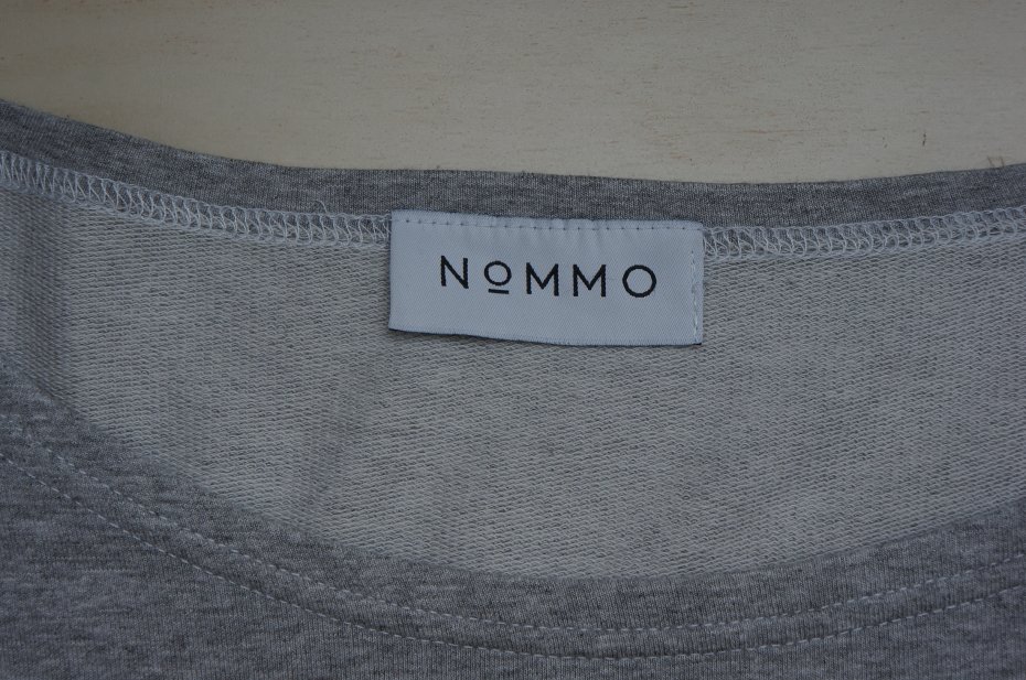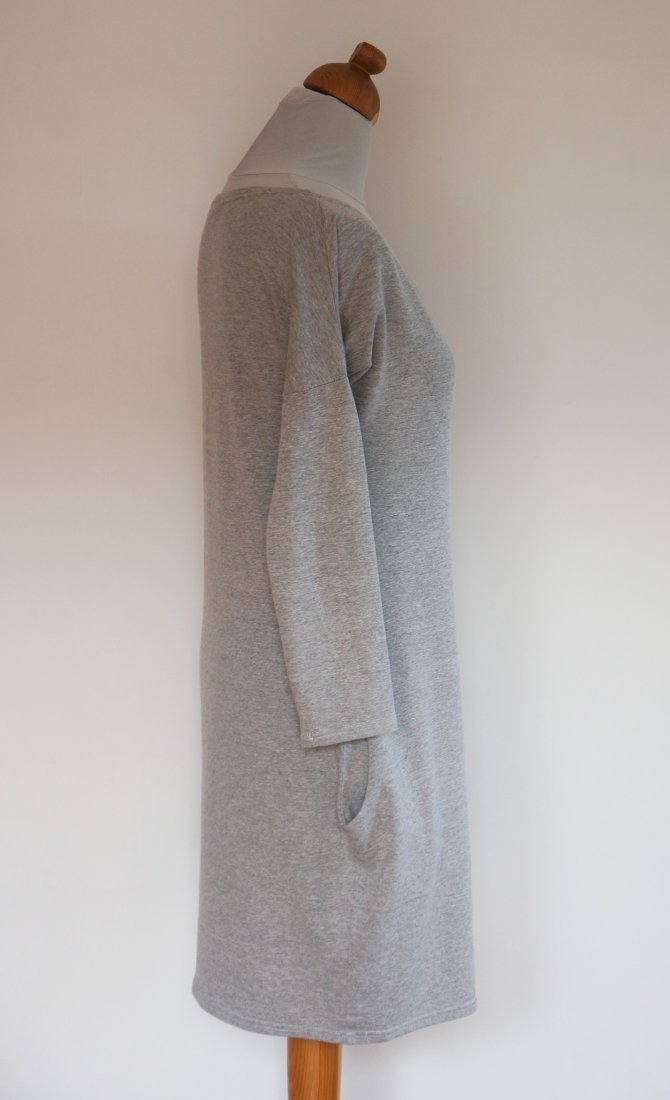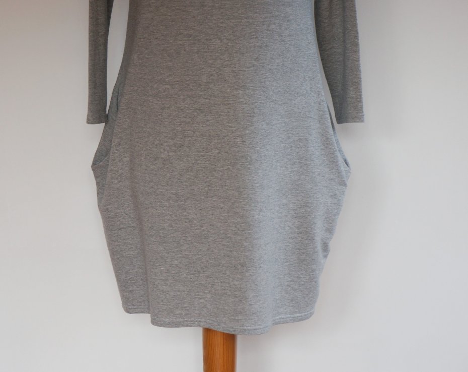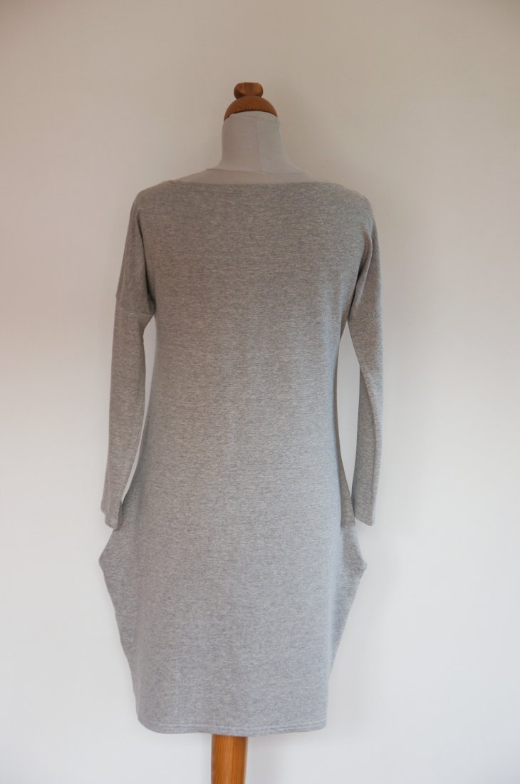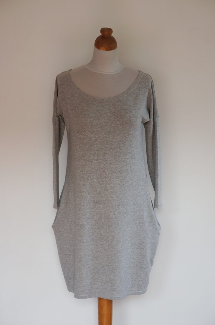 Sukienka / tunika marki Nommo. Dekolt łódkowy. Rękawy wszyte kimonowo. Po bokach wszyte kieszenie. Tkanina dzianinowa. Kolor szary. Stan bardzo dobry.