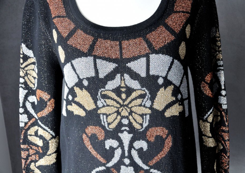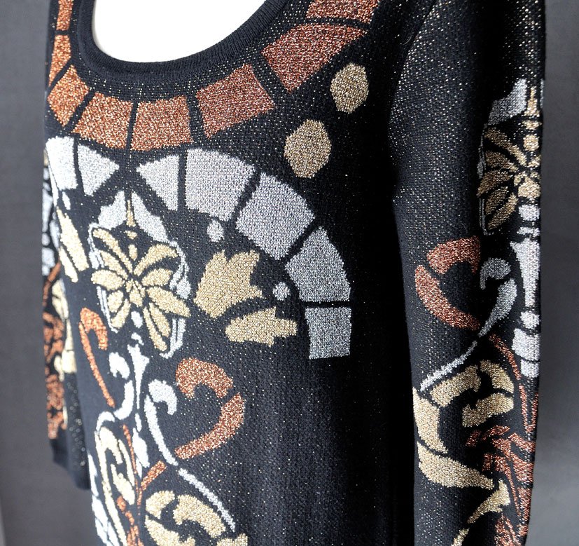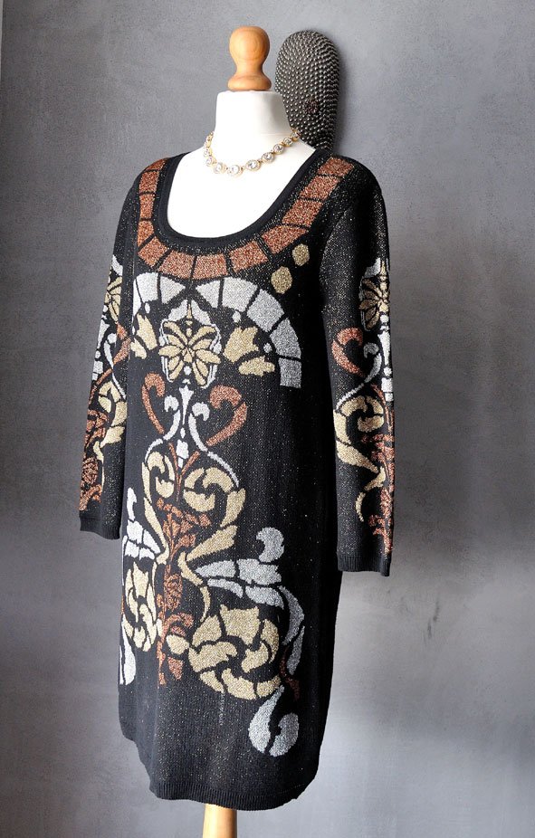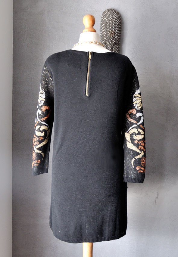 Projekt RIVER ISLAND z kolekcji L'Art. Uszyta ze sweterkowej, miękkiej dzianiny w kolorze czarnym. Na przodzie i rękawach widnieje piękny ornament w odcieniach brązu, srebra i złota, dodatkowo ozdobiony włóknem metalicznym. Pięknie się mieni.
