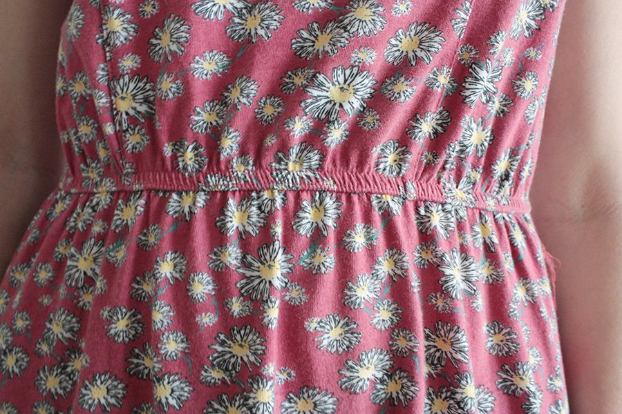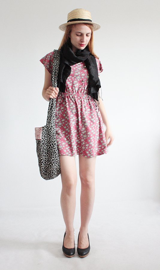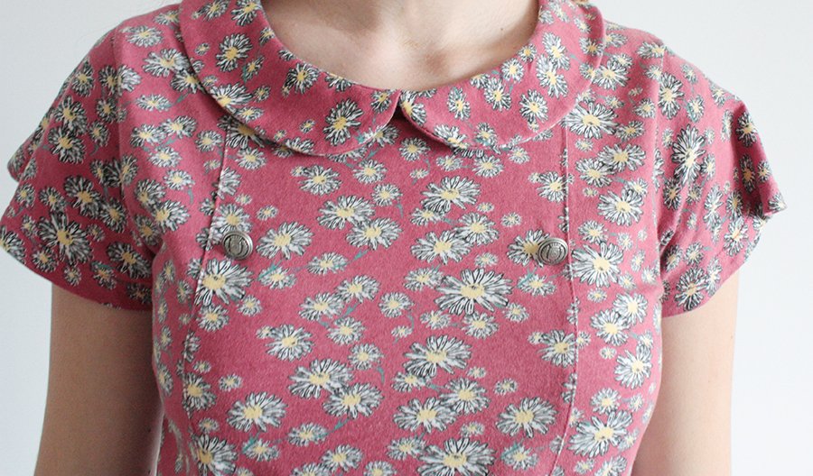 Urocza sukienka w margerytki, z kołnierzykiem typu bebe w stylu retro. Posiada ozdobne atrapy guzików (z przodu). Wykonana w całości z bawełny.